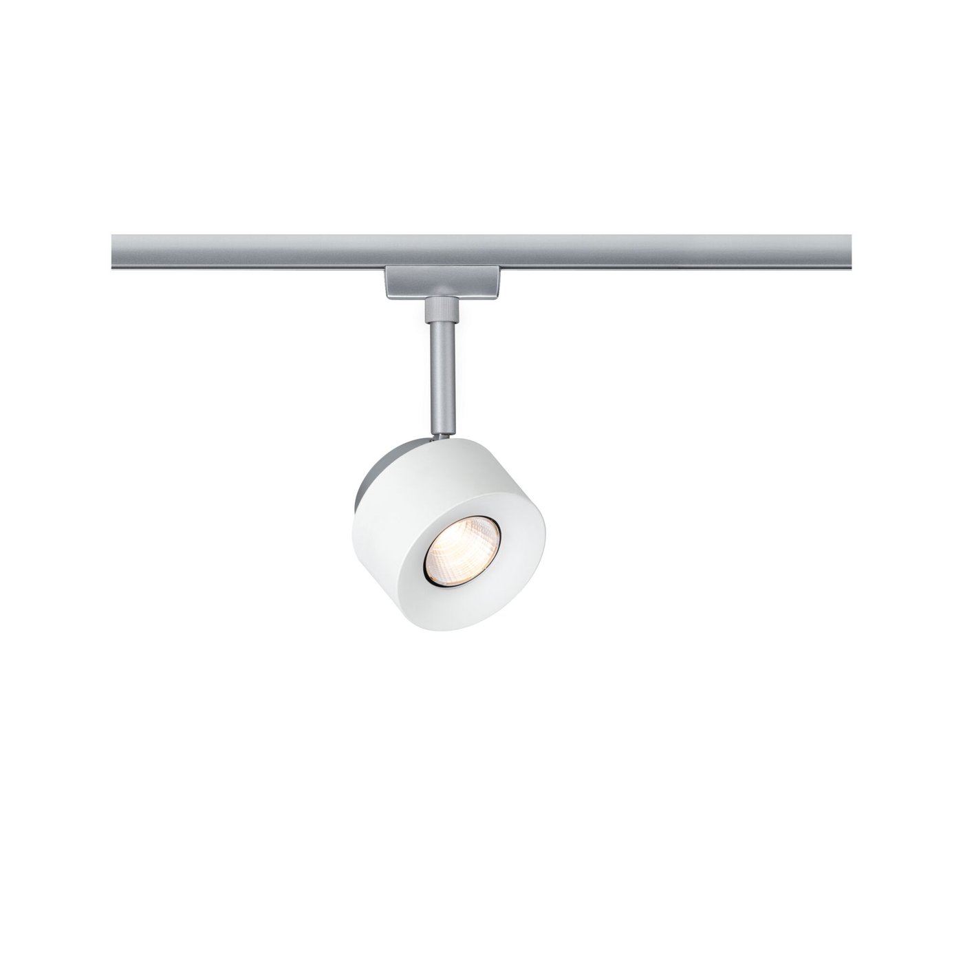 Трековый светильник Paulmann из коллекции Pane предназначен для установки на шинопровод системы URail и используется для направленного освещения отдельных зон. Конструкция включает адаптер для крепления к шине и поворотную круглую головку на коротком кронштейне, позволяющую изменять направление светового потока. Встроенный светодиод мощностью 7,4 Вт обеспечивает световой поток 400 лм с тёплой цветовой температурой 2700 K и углом рассеивания 45°. Высота светильника составляет около 197 мм, корпус выполнен из металла и пластика в белом цвете с элементами матового хрома. Питание осуществляется от сети 230 В, предусмотрена работа с диммерами, совместимыми с системой URail.