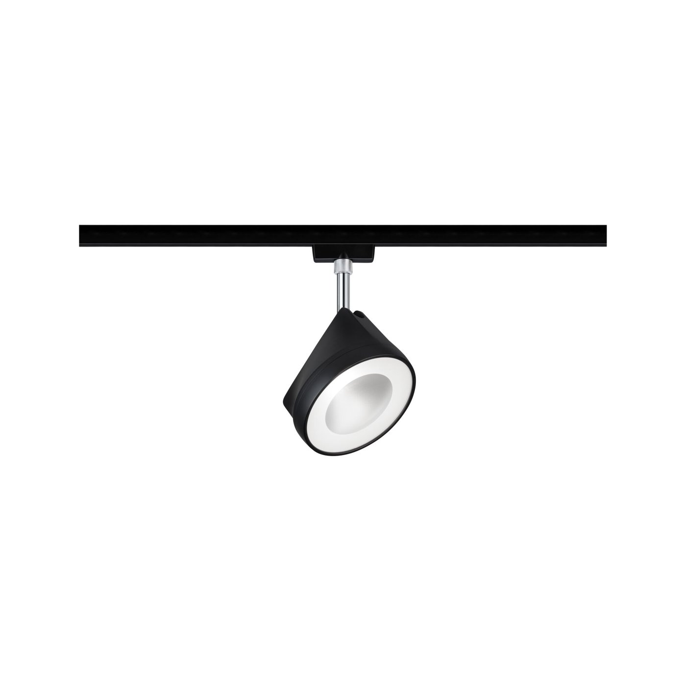 Трековый светильник Paulmann Arena, артикул 96942, предназначен для потолочного монтажа и дает направленный свет за счет встроенного объектива. Модель выполнена из металла в черном матовом цвете с хромированными деталями, а компактная цилиндрическая головка на коротком подвесе делает ее удобной для акцентной подсветки в составе шинной системы. При мощности 14 Вт светильник выдает 890 лм и работает с цветовой температурой 4000 К, поэтому свет получается более нейтральным и подходит не только для жилых, но и для рабочих зон. Угол рассеивания 82° задает достаточно широкое, но направленное пятно света. Поддерживается диммирование через совместимые диммеры типов R, L и C, а ресурс источника света составляет 30 000 часов.