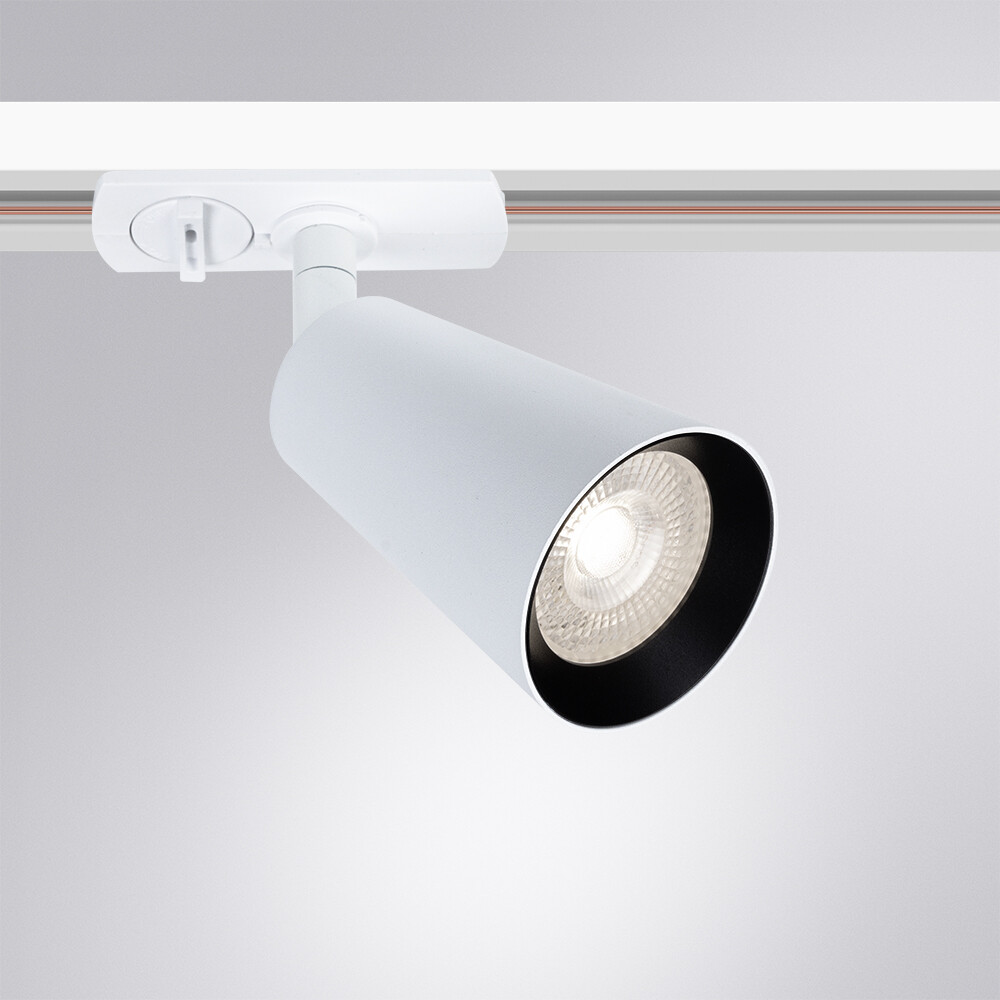 Светильник для магнитного трека Arte Lamp Cintura A2354PL-1WH выполнен в современном стиле и отличается лаконичной формой с поворотным плафоном усечённого конического силуэта. Корпус и арматура изготовлены из алюминия с матовой белой поверхностью, благодаря чему модель выглядит нейтрально и аккуратно в светлых интерьерных решениях. Светильник рассчитан на установку одной лампы с цоколем GU10 мощностью до 35 Вт и допускает использование галогенных или светодиодных источников света. Конструкция обеспечивает свободное направление светового потока, что позволяет точно настраивать акцентное или функциональное освещение. Компактные размеры 60×92 мм обеспечивают визуальную лёгкость и аккуратную интеграцию в магнитную трековую систему. Монтаж осуществляется непосредственно на трек, светильник предназначен для потолочного размещения. Модель подходит для использования в офисных и жилых интерьерах, включая гостиную и кабинет, дополняя современные световые сценарии.