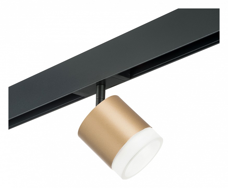 Светильник предназначен для однофазной трековой системы с возможностью вертикального поворота на 360° и горизонтального на 90°, крепится на трек. Цилиндрический корпус выполнен из металла с глянцевой золотой отделкой и белым акриловым плафоном, позволяющим направлять свет в любом направлении. Светильник рассчитан на одну светодиодную лампу GX53 мощностью 15 Вт с возможностью диммирования. Размеры корпуса составляют 105×80 мм, общая высота подвеса — 181 мм, рассчитан на освещение площади до 7,5 м². Черная арматура трека и разноцветный корпус обеспечивают техническое исполнение, подходящее для офисов, кабинетов и гостиной, создавая локализованное регулируемое освещение.