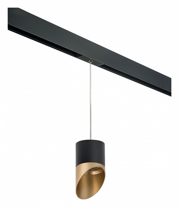 Подвесной светильник для однофазного трека, предназначенный для установки на шинопровод и создания направленного освещения вниз. Конструкция включает цилиндрический плафон диаметром 80 мм, подвешенный на кабеле длиной 209 мм, общая длина составляет 1439 мм. Нижняя часть корпуса имеет скошенный срез, который открывает источник света и задает направленный под углом световой поток. Внешняя поверхность черная, внутренняя часть плафона золотистая, материал — металл с матовой отделкой. Используется одна светодиодная лампа с цоколем GX53 мощностью до 15 Вт, лампа в комплект не входит. Подключение к сети 220 В осуществляется через трековую систему, поддерживается диммирование, степень защиты IP20, подходит для жилых помещений.