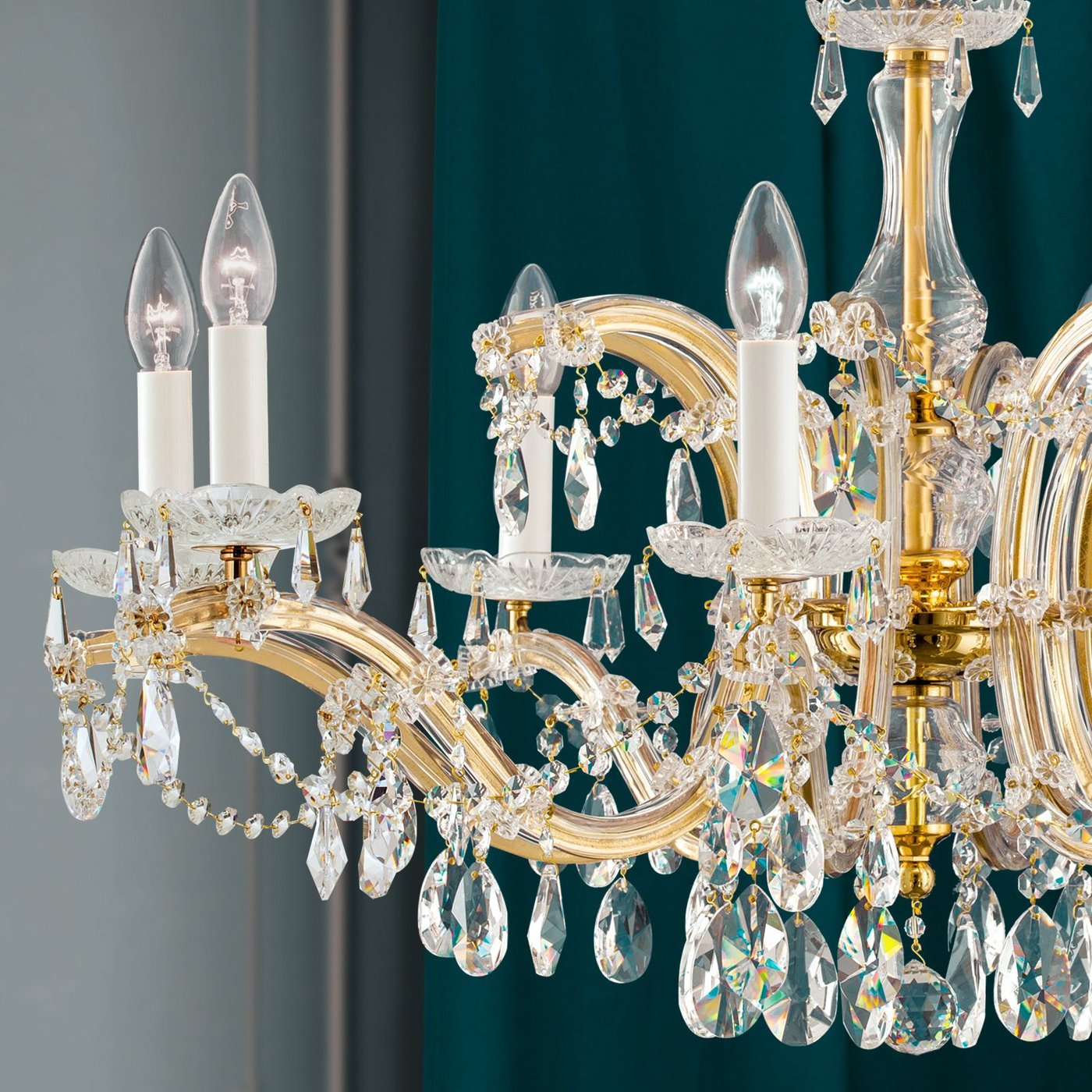 Хрустальная люстра с восемью плафонами из серии MARIA THERESIA особенно богато украшена хрусталем. Крупные миндалины, сосульки, цепи и шары из кристаллов Swarovski® и Schöler Crystal® создают сияющий, мерцающий, сверкающий центральный элемент, который мгновенно очаровывает всех, кто входит в комнату. Кристаллическая огранка действует как стократная призма, позволяя свету танцевать всеми цветами радуги в стильной гостиной или гостиной. Позолоченные консольные кронштейны поддерживают пламя, напоминающее пламя свечей. Хрустальная балясина украшает позолоченную центральную колонну. Восемь патронов E14 обеспечивают хрустальную люстру мощностью до 40 Вт каждый. Люстры этой коллекции представлены в широком разнообразии вариантов.