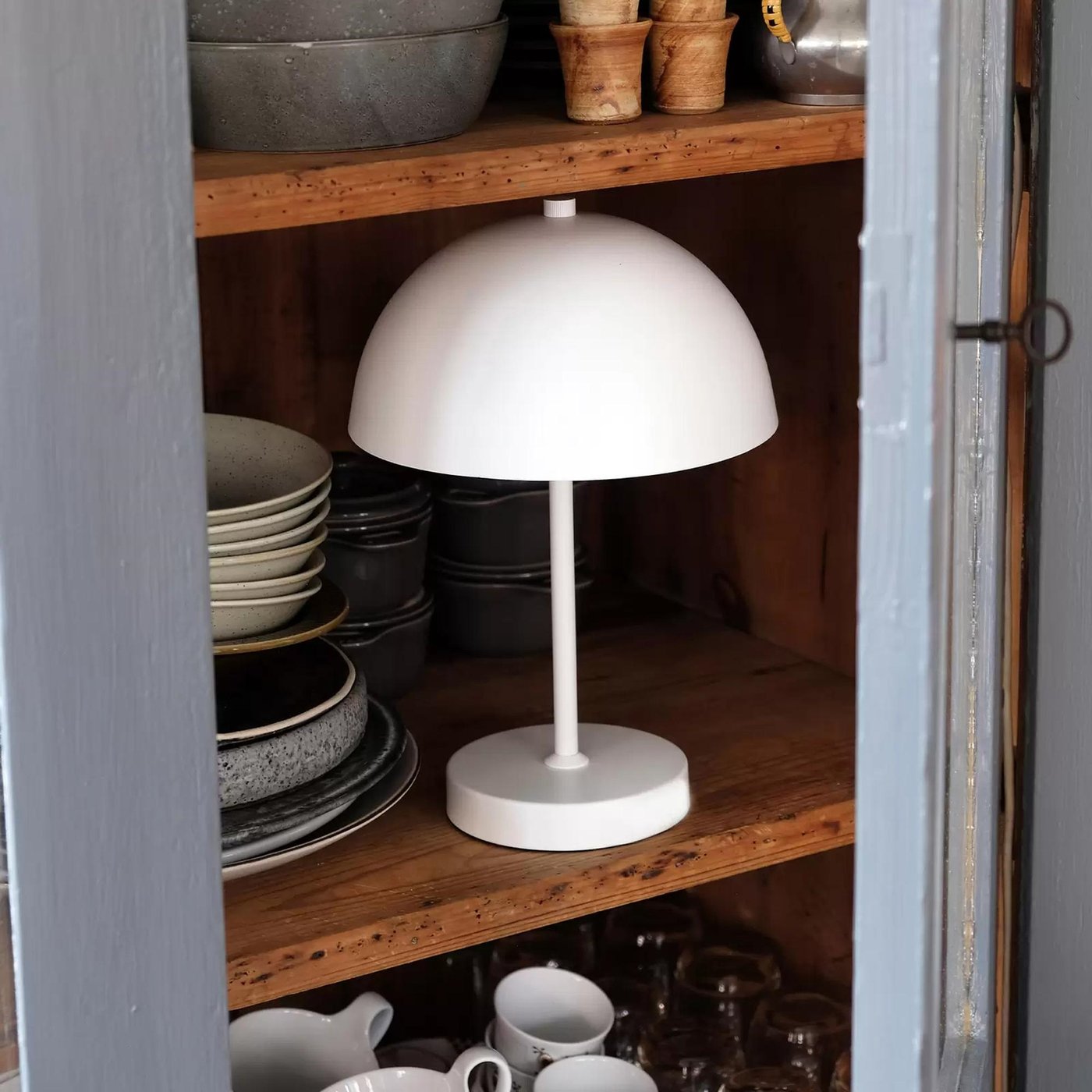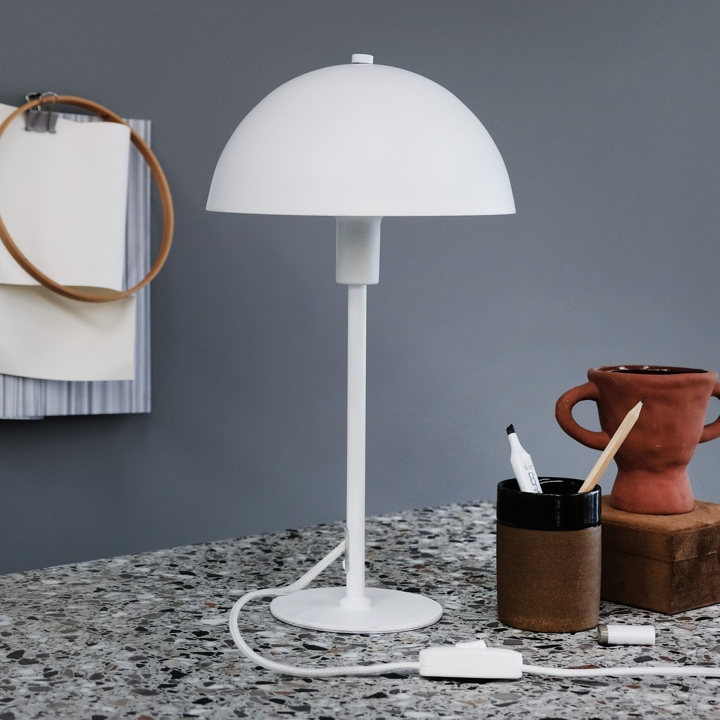 настольная лампа с куполообразным плафоном белого цвета на цилиндрической подставке