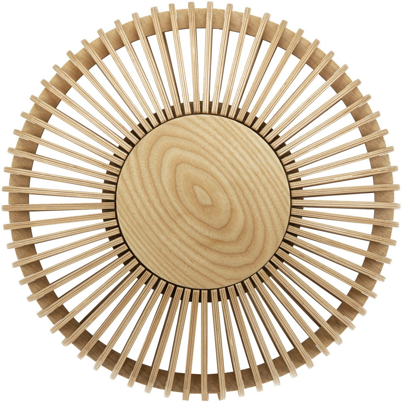 Настенный светильник с круглым корпусом и радиальной конструкцией абажура из деревянных ламелей, равномерно расходящихся от центральной части. Источник света расположен в центре и закрыт диском, а свет проходит через промежутки между элементами, формируя выраженный световой рисунок на стене. Модель Clava Up Wood от Umage, артикул 2381, выполнена в натуральной отделке дуба и изготовлена из ясеня, дуба и ламинированного шпона. Диаметр составляет около 350 мм, высота — 166 мм. Используется одна лампа с цоколем E27 мощностью до 15 Вт, лампа в комплект не входит. Предназначен для декоративного настенного освещения в жилых помещениях.