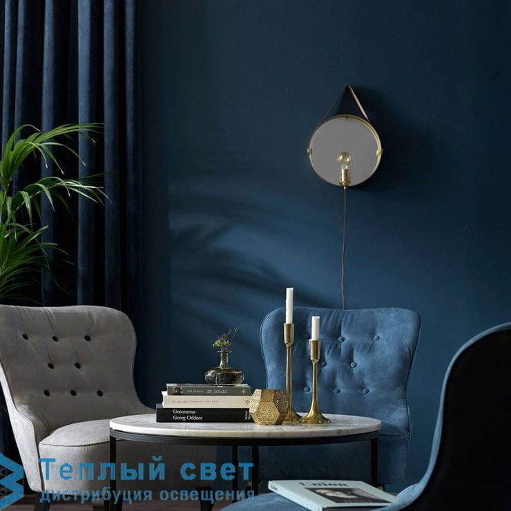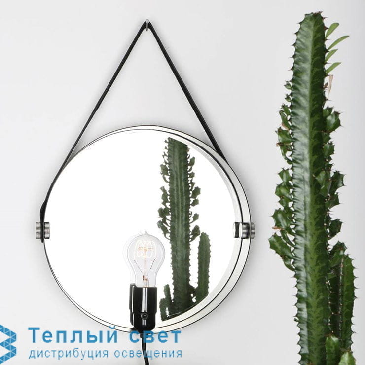 Настенный светильник Mirror из коллекции Hangover под редакцией Globen Lighting, состоящий из круглой металлической конструкции, зеркала и кожаного подвесного ремня.