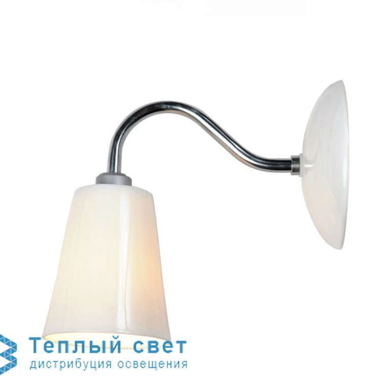 Настенный светильник из коллекции Swan под редакцией Original BTC, состоящий из круглого настенного основания и изогнутого трубчатого кронштейна; и хром и конический абажур из английского фарфора.