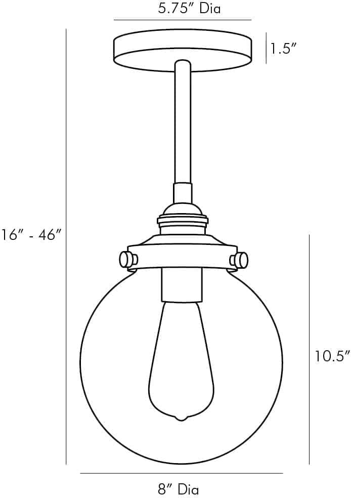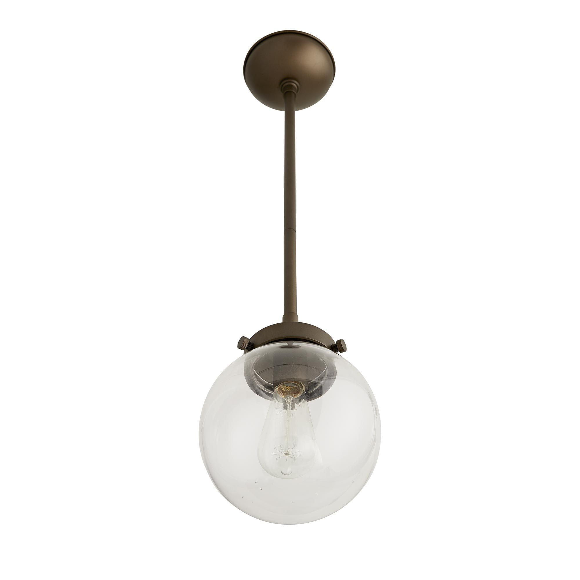 Light a space with timeless design. This classic globe pendant features a clear glass shade and aged brass finished steel, giving it an updated, industrial style. Consider an antique style bulb to create a subtle glow with stylized filament designs. Shown with an Edison bulb. Also comes in Large Aged Brass (49208), Large Aged Iron (49207) and Small Aged Iron (49210). Additional pipe available (PIPE-192). Approved for use in outdoor areas.