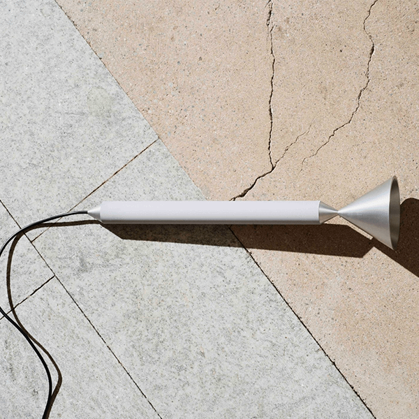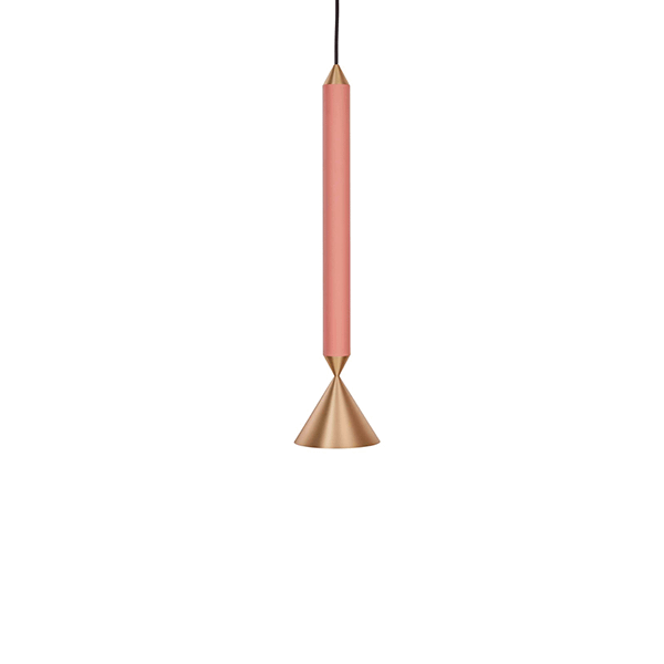 Подвесной светильник с вытянутым цилиндрическим корпусом и коническим элементом в нижней части, формирующим направленный акцент вниз. Конструкция рассчитана на вертикальное размещение и подвешивается на кабеле длиной около 3 м, что позволяет варьировать высоту установки и использовать несколько приборов в композиции. Диаметр корпуса составляет около 12,5 см при общей высоте 51,5 см, благодаря чему светильник занимает минимум пространства по ширине. Внутри используется одна лампа с цоколем G9 мощностью до 20 Вт. Основные материалы — алюминий и латунь; корпус окрашен в розовый цвет, а нижний конус выполнен из латуни, что визуально разделяет элементы конструкции.
