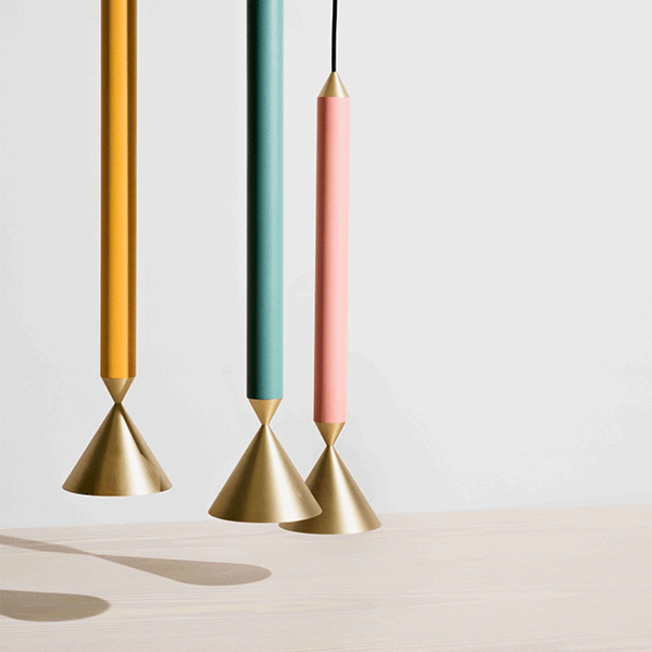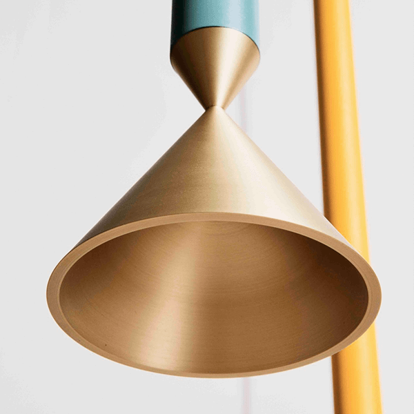 Подвесной светильник с вытянутым цилиндрическим корпусом и акцентированными коническими элементами на концах, формирующими направленную композицию по вертикали. Конструкция подвешивается на кабеле длиной около 3 м и рассчитана на одиночное или групповое размещение, в том числе на разной высоте. Основной корпус имеет диаметр около 12,5 см при общей высоте 51,5 см, что делает модель узкой и визуально вытянутой. Внутри используется одна лампа с цоколем G9 мощностью до 20 Вт. Материалы указаны как алюминий и латунь, при этом корпус выполнен в синем цвете, а нижний конус — в латунном исполнении, что подчёркивает разделение элементов конструкции.