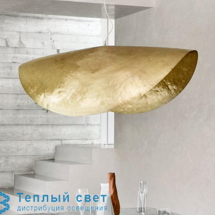 Подвесной светильник большого формата из коллекции Brass под редакцией Gervasoni, состоящий из потолочной розетки, шнура питания и металлического троса, поддерживающего абажур, состоящий из изогнутая пластина из чеканной латуни.