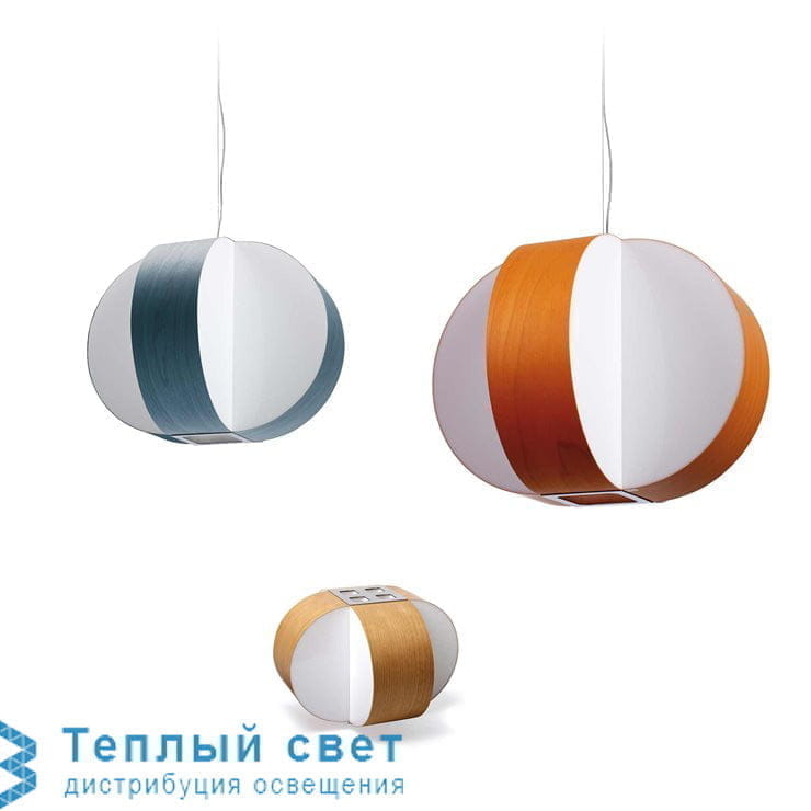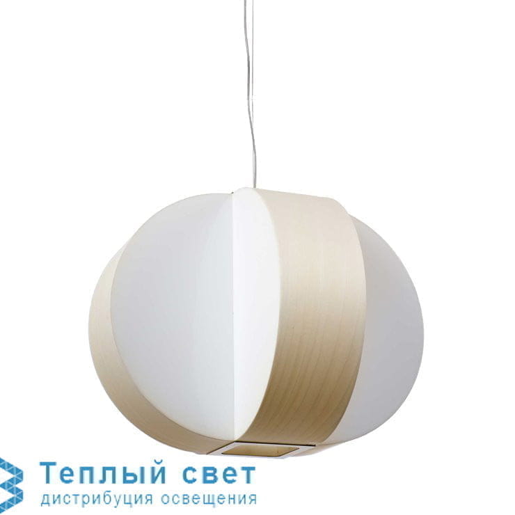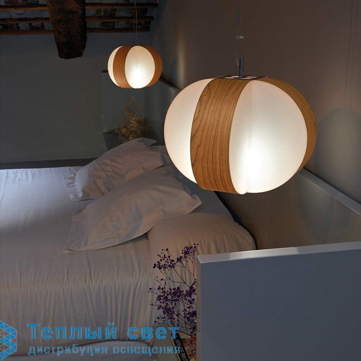 Подвесной светодиодный светильник из коллекции Carambola, состоящий из хромированной потолочной розетки, прозрачного шнура питания и троса металлической стропы, поддерживающей абажур, состоящий из четыре четверти опалового поликарбоната, облицованного натуральным деревом.