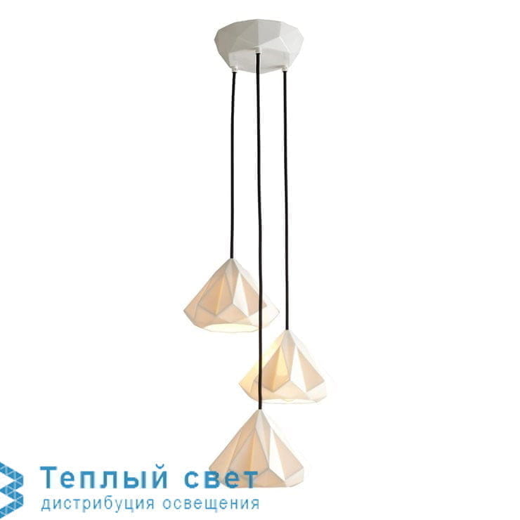 Подвесной светильник с групповой композицией из трёх отдельных плафонов предназначен для акцентного освещения и зонирования пространства. Основание выполнено в виде гранёной потолочной розетки из фарфора, от которой отходят три текстильных кабеля, распределяющих подвесы на разной высоте. Каждый световой элемент представляет собой гранёный фарфоровый диффузор с направленным вниз светом, внутри установлен патрон E27, рассчитанный на лампы до 10 Вт, которые приобретаются отдельно. Конструкция позволяет варьировать расположение плафонов за счёт длины шнуров, формируя вертикальную композицию, что удобно для размещения над столами, в лестничных проёмах или зонах с высоким потолком.