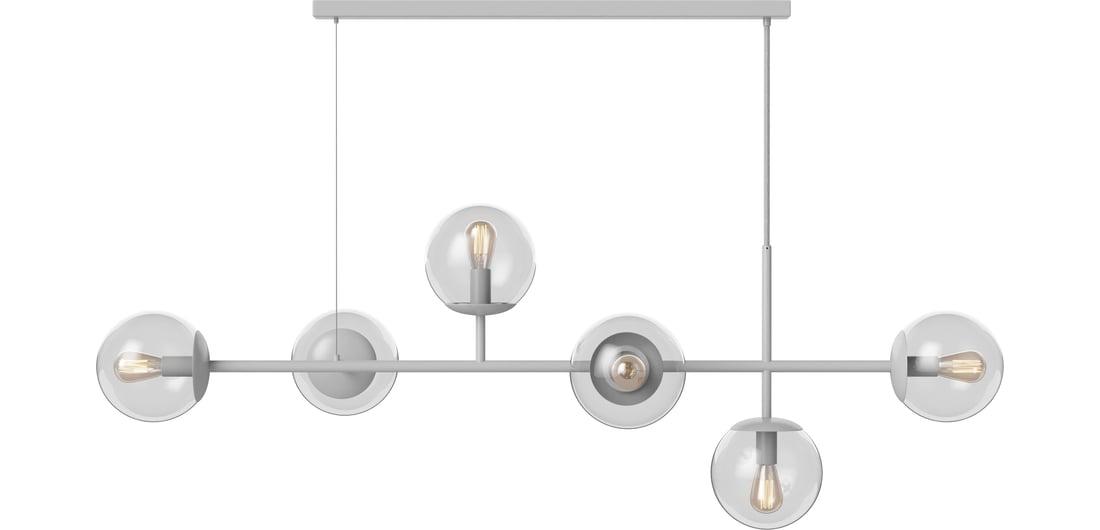 Подвесной светильник линейной конструкции с несколькими стеклянными плафонами, расположенными вдоль горизонтальной металлической штанги. Каждый источник света помещён в отдельный прозрачный шар, закреплённый на равном расстоянии, что формирует распределённый свет по длине конструкции. Подвес осуществляется на двух тросах от прямоугольной потолочной планки, что фиксирует положение светильника параллельно поверхности. В отделке используется сочетание металла и стекла, видны открытые лампы внутри шаров, влияющие на характер света и его направленность. Модель относится к коллекции Orb бренда Bolia, артикул 20-116-03_00001.