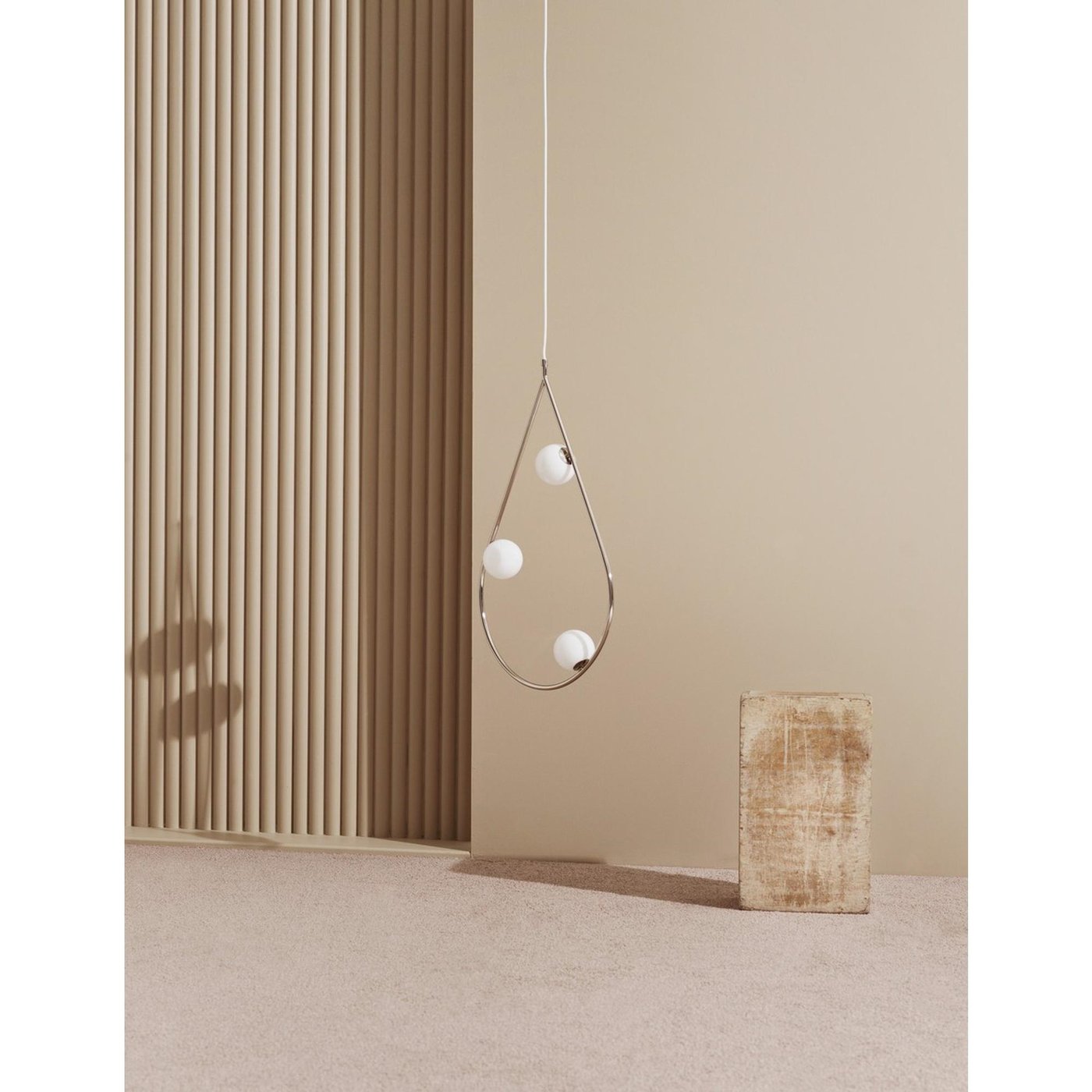 Подвесной светильник с открытой конструкцией в форме капли предназначен для декоративного и локального освещения в интерьере. Основа выполнена из изогнутого металлического контура с никелированным покрытием, внутри которого размещены три сферических плафона из опалового материала, распределённых по высоте. Источники света с цоколем G9 располагаются внутри шаров, суммарно предусмотрено три лампы мощностью до 20 Вт каждая. Светильник подвешивается на текстильном кабеле длиной около 3 метров с потолочной чашей. Модель из коллекции PEARLS производителя Pholc, артикул 530134, имеет габариты около 60 см по высоте, 80 см по ширине и 10 см по глубине, и используется как выразительный подвесной элемент в жилых пространствах.