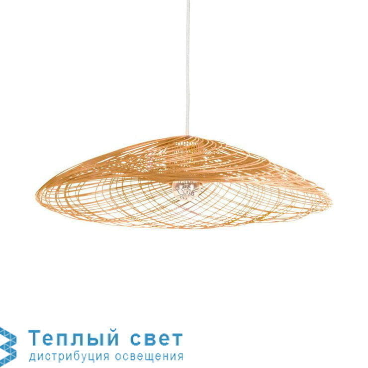 Подвесной светильник среднего формата (M) из коллекции Satelise, состоящий из потолочной розетки, шнура питания и стропы, поддерживающей круглый абажур, состоящий из переплетенный натуральный ротанг.