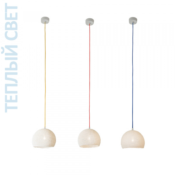 Подвесной светильник. Белый абажур с перфорированной сетчатой структурой (100% шерсть, прочная и огнестойкая благодаря смоле). Лапреновый провод доступен в следующих цветах: жёлтый, красный, синий, белый, золотой, флуоресцентный оранжевый. Диаметр: 21 см. Сделано в Италии. Сетчатая структура полностью изготовлена вручную.
