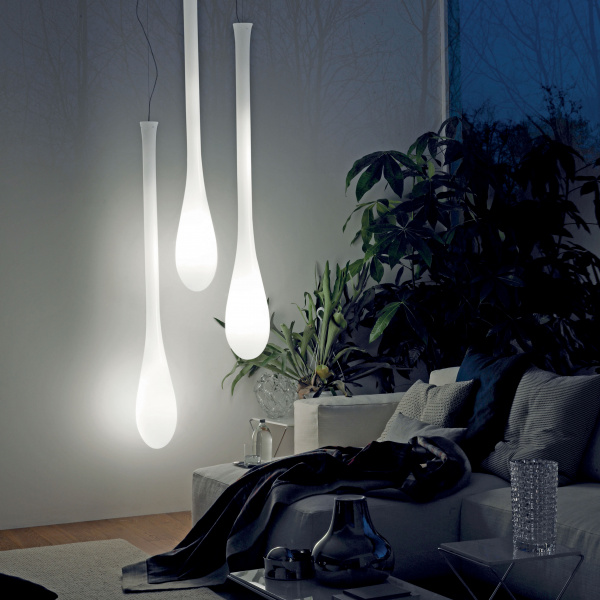 Lacrima — дизайнерская люстра с плафоном из глянцевого белого стекла, выполненным вручную. Металлические детали покрыты сатинированным никелем. Этот подвесной светильник имеет вытянутую форму, напоминающую каплю. Рекомендуется для освещения помещений в современном стиле, особенно в помещениях с высокими потолками. Он рассеивает мягкий белый свет. Lacrima доступна в двух размерах: большом и маленьком.