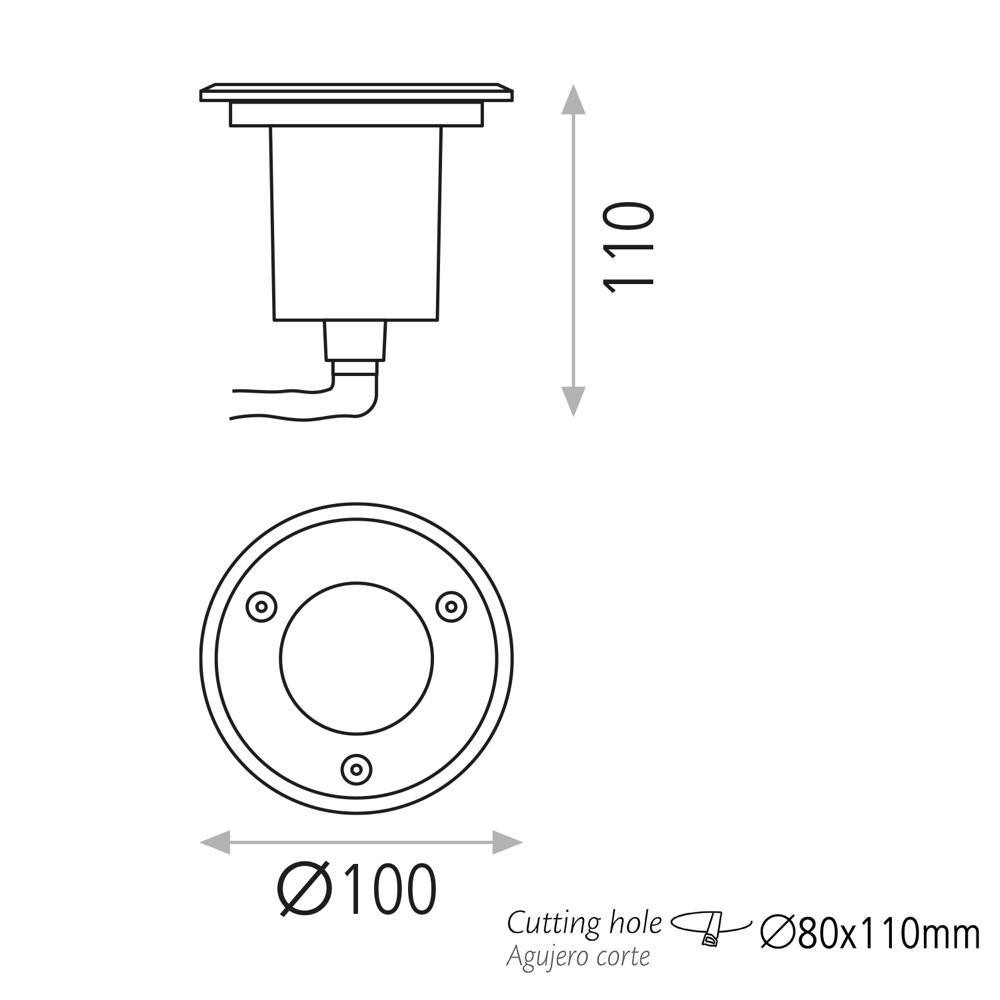 Встраиваемый в грунт светильник имеет размер 10x11 см и глубину установки 11 см. Возможно последовательное соединение нескольких светильников для создания индивидуального освещения. Форма лампы — PAR16, класс защиты — 1.