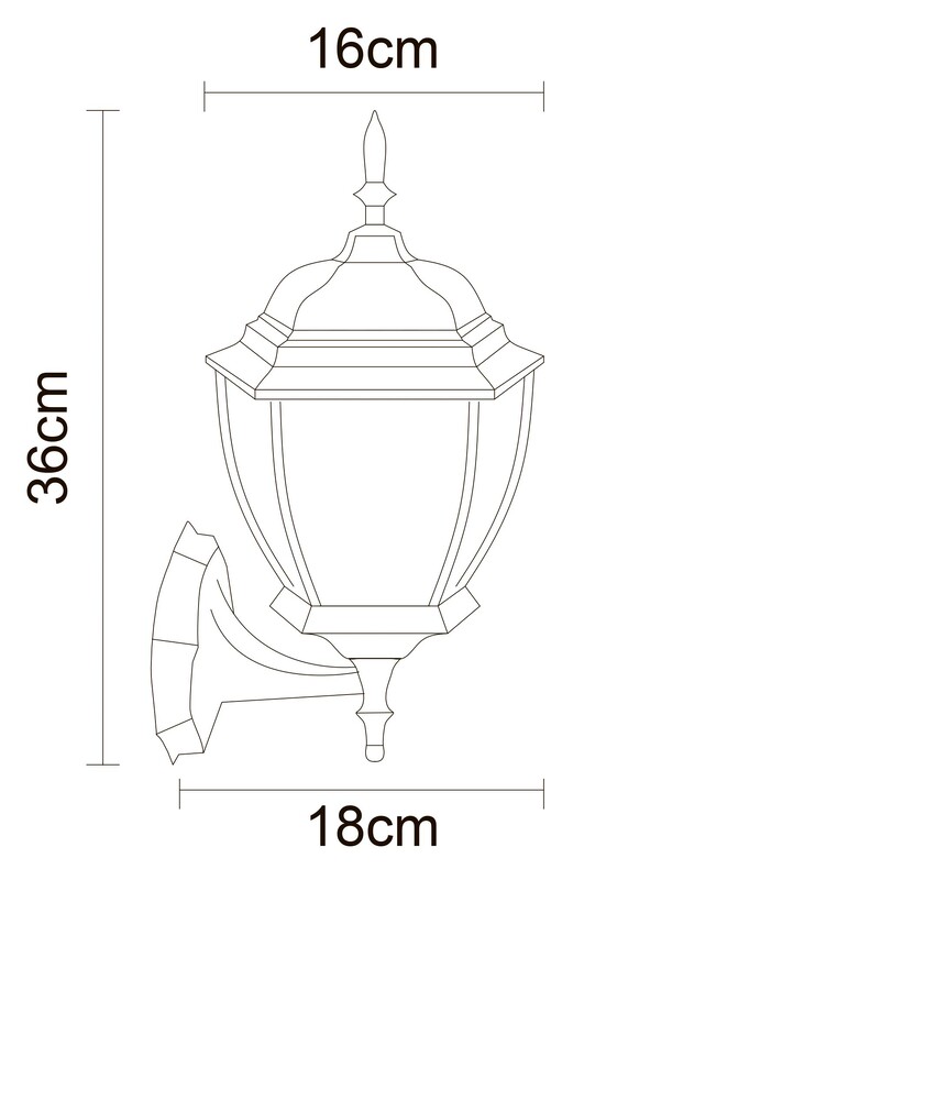 Уличный настенный светильник выполнен в классическом стиле и предназначен для установки на фасадах и наружных стенах. Металлическая арматура с матовой поверхностью окрашена в чёрный цвет с золотой патиной, что подчёркивает традиционный характер модели и декоративную форму корпуса. Прозрачный стеклянный плафон колоколообразной формы направлен вверх и обеспечивает открытый обзор источника света. Светильник рассчитан на одну лампу с цоколем E27 мощностью до 60 Вт, лампа в комплект не входит, питание осуществляется от сети 220 В. Компактные габариты корпуса составляют 160×360×180 мм, крепление выполняется на монтажной пластине. Модель предназначена для использования на улице и имеет степень защиты IP44, что делает её подходящей для эксплуатации в условиях внешней среды.