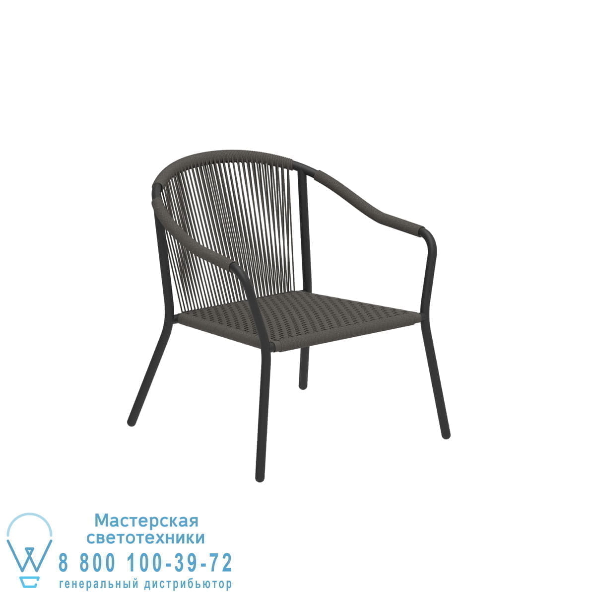 Кресло для отдыха из коллекции Samba с каркасом из окрашенного алюминия и сиденьем с плетёной структурой из тканого волокна рассчитано на использование на открытых площадках и в зонах отдыха. Конструкция состоит из лёгкой металлической рамы на четырёх ножках с плавно изогнутыми подлокотниками и спинкой, в которую интегрировано плотное плетение, формирующее одновременно опору и посадочную поверхность. За счёт жёсткого каркаса и натянутого волокна кресло держит форму без дополнительных подушек и может использоваться как самостоятельный элемент в террасной или садовой мебели. Основное отличие — сочетание алюминиевой основы и цельного плетёного блока сиденья и спинки.