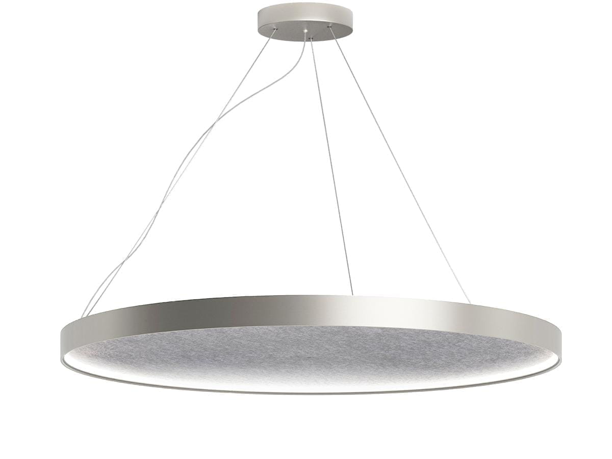 Подвесной светильник для интерьера совмещает освещение и акустическую функцию, поэтому важен не только как источник света, но и как элемент снижения шума в помещении. Конструкция выполнена в виде большого тонкого диска на тросовых подвесах: несущая часть изготовлена из гнутого экструдированного алюминия, а звукопоглощающая панель из базальтового волокна класса C снижает отражённый звук с показателем NRC 0,7. Свет излучается вниз через диффузор из экструдированного поликарбоната с опаловым покрытием, при этом в характеристиках указаны LED, 2700 K, световой поток 5670 лм, мощность 51 Вт и ресурс 60 000 часов. Драйвер встроен, поддерживается диммирование DALI/Push DIM, степень защиты IP20, масса — 5,8 кг.