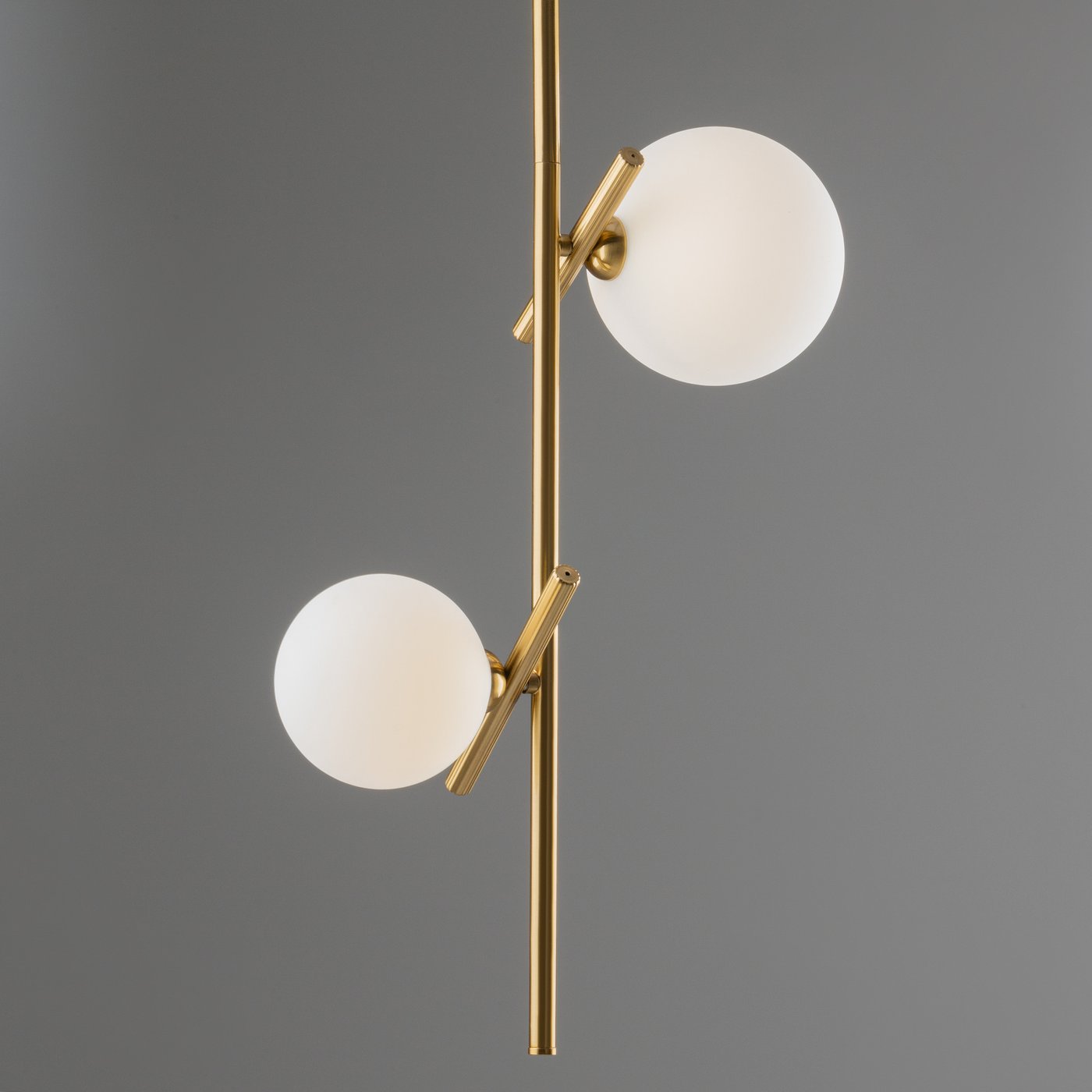 подвесной светильник с двумя матовыми шарами на латунной штанге