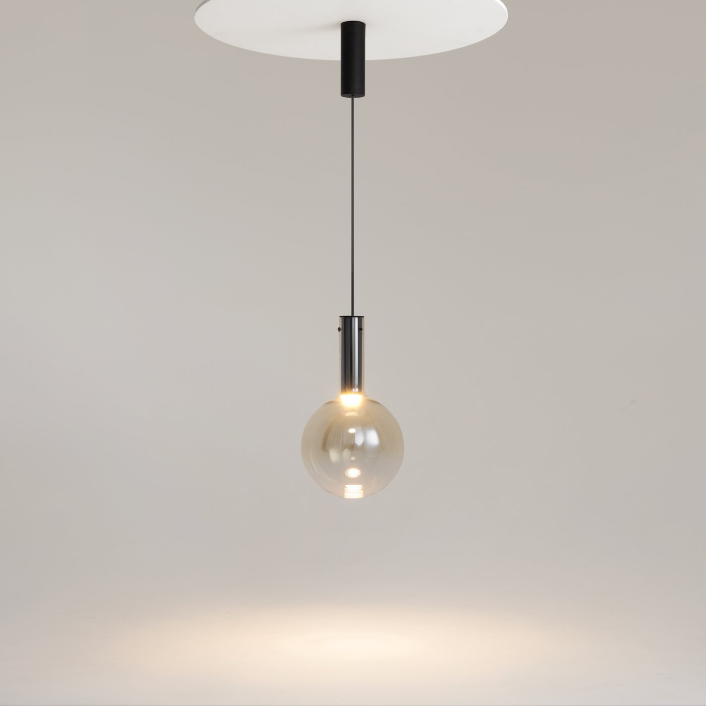 Металлическая арматура, цвет - черный, белый. Выдувной плафон-шар из стекла с вытянутым цилиндрическим основанием в трех цветах: дымчато-черный, туманно-белый, бежево-коньячный. LED-источник света в основании плафона. Цветовая температура 3000К. Два диаметра плафонов и регулируемая длина проводов для создания разнообразных композиций.