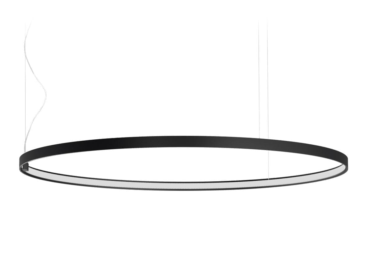 Одиночный или многоместный подвесной светильник для интерьера, с прямым и непрямым световым излучением. Гнутая экструдированная алюминиевая конструкция, окрашенная полиакриловой краской белого, черного, бронзового цвета, матовой латуни или титана. Рассеиватель из экструдированного поликарбоната с опаловым покрытием. Комплект для подвески с замками и стальными тросами длиной 5 м (196,9"). Силовой кабель длиной 5 м (196,9") из прозрачного ПВХ. Поставляется без силового навеса.