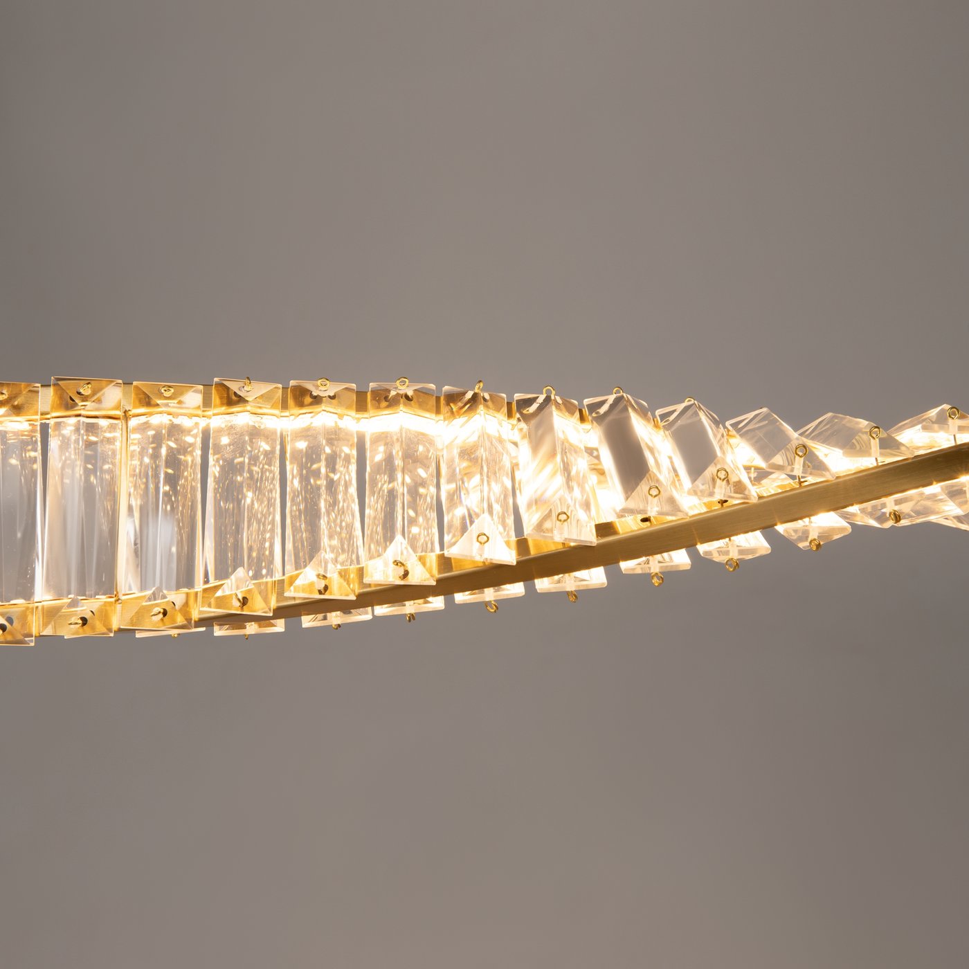 Металлическая арматура в золотом цвете. Асимметричный хрустальный декор. Трендовая форма окружности. LED-источник света с температурой 4000К. Высокий индекс цветопередачи 90Ra.