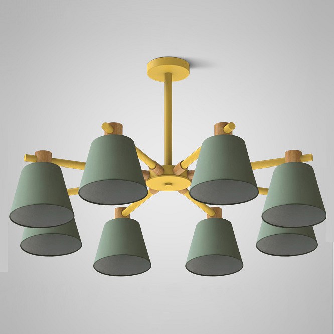 Потолочный светильник из коллекции Natura с радиальной композицией плафонов, установленный на центральной штанге. Конструкция включает центральный узел, от которого расходятся держатели с текстильными плафонами, образуя круг диаметром 900 мм. Плафоны имеют форму усечённых конусов и направлены вниз, обеспечивая освещение зоны под светильником. Арматура выполнена из сочетания металла и дерева с матовой поверхностью, окрашена в жёлтый цвет, плафоны выполнены из текстиля зелёного цвета. Высота конструкции составляет 335 мм, крепление осуществляется на монтажной пластине. Используются лампы с цоколем E27 мощностью до 60 Вт, питание 220 В. Светильник рассчитан на использование в помещениях и имеет степень защиты IP20.