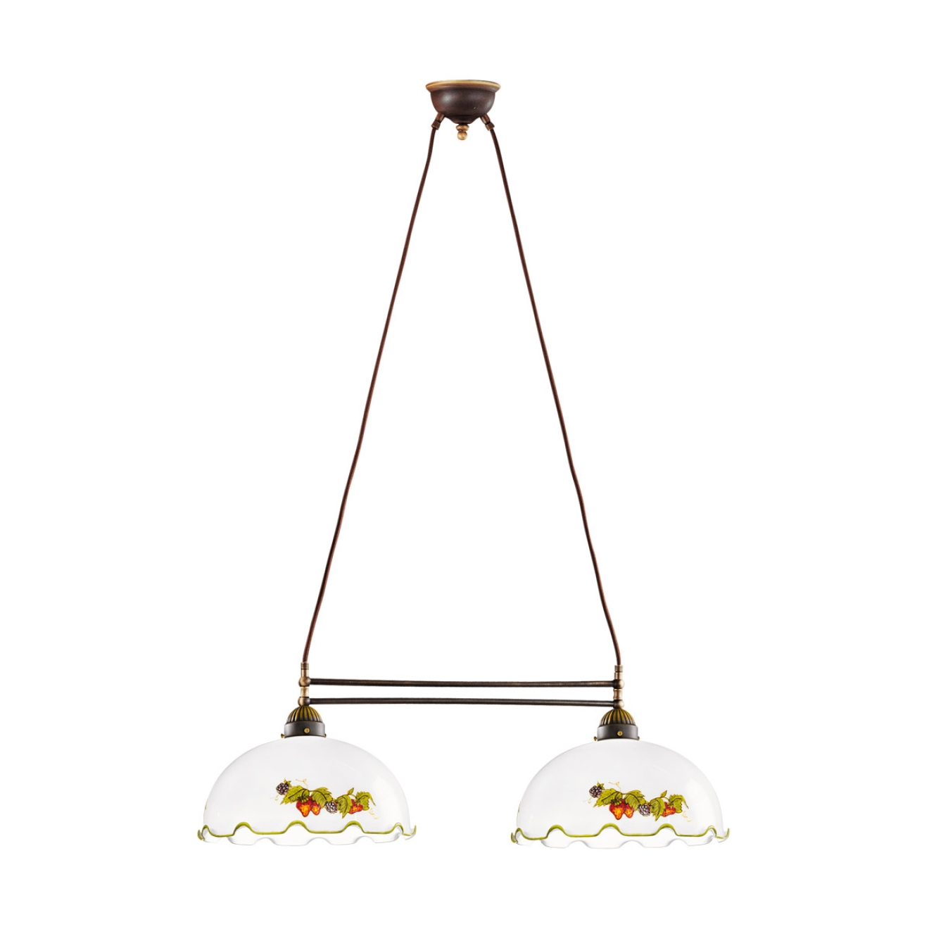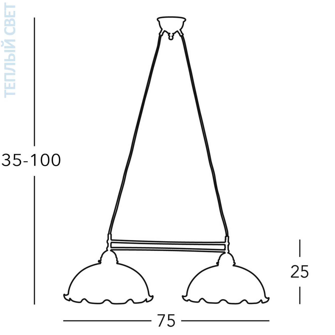 Подвесной светильник с двумя плафонами предназначен для освещения обеденных столов и рабочих поверхностей, где требуется равномерное распределение света вдоль длины. Конструкция включает горизонтальную металлическую планку длиной 75 см с двумя подвесными плафонами, соединённую с потолочным основанием через регулируемые подвесы. Плафоны выполнены из стекла с округлой формой и волнистым нижним краем, дополнены декоративным цветочным рисунком, направляют свет вниз. Металлические элементы имеют отделку под состаренную латунь. Используются две лампы с цоколем E27. Высота регулируется в диапазоне от 35 до 100 см, при высоте плафонов около 25 см, что позволяет подбирать уровень подвеса под конкретную зону.
