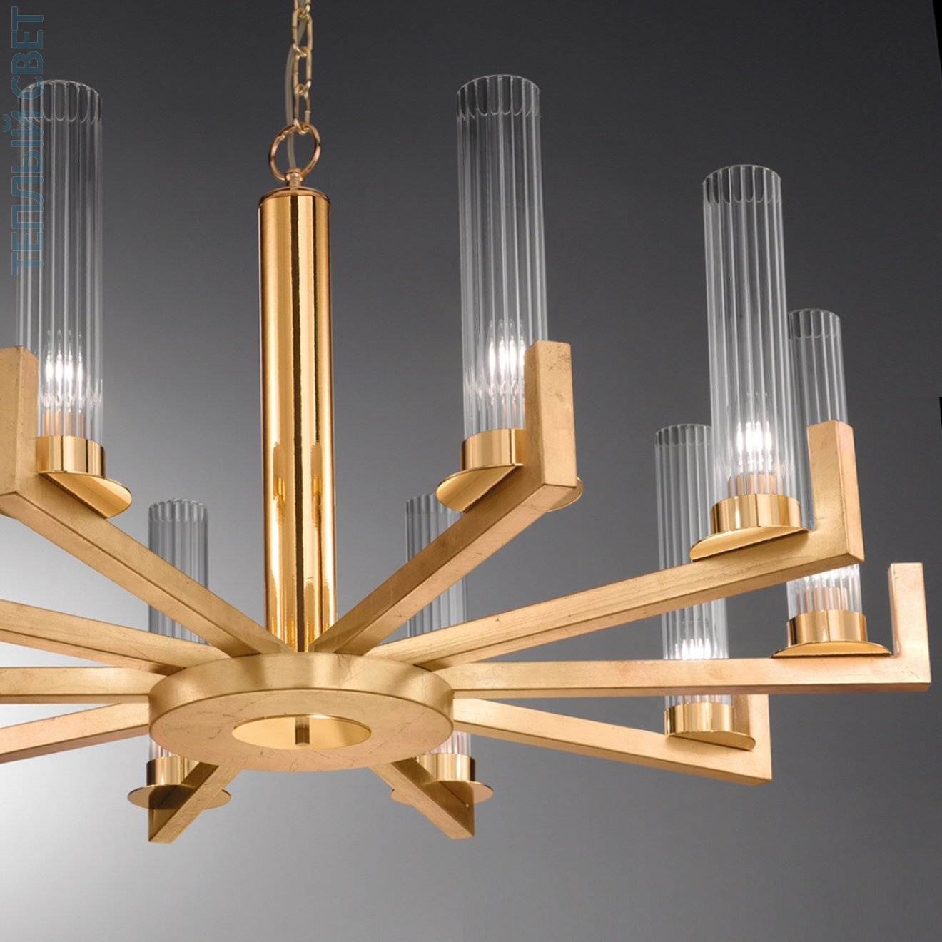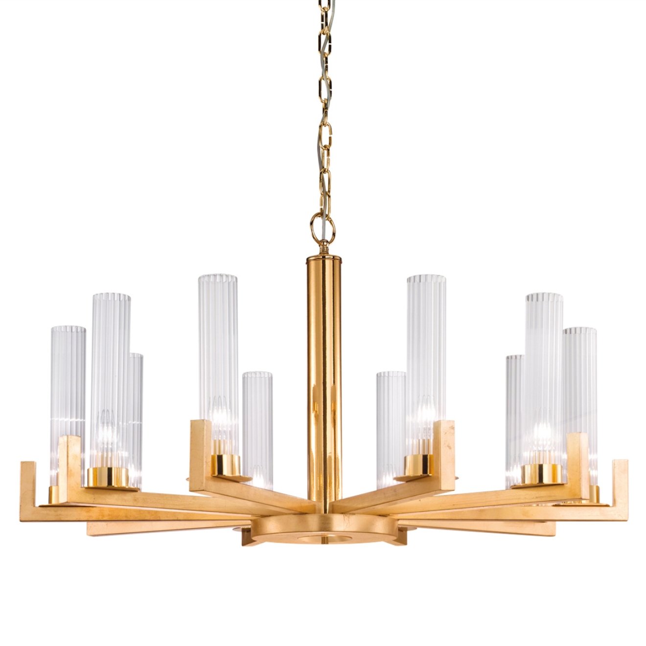 люстра с десятью цилиндрическими плафонами на золотом каркасе