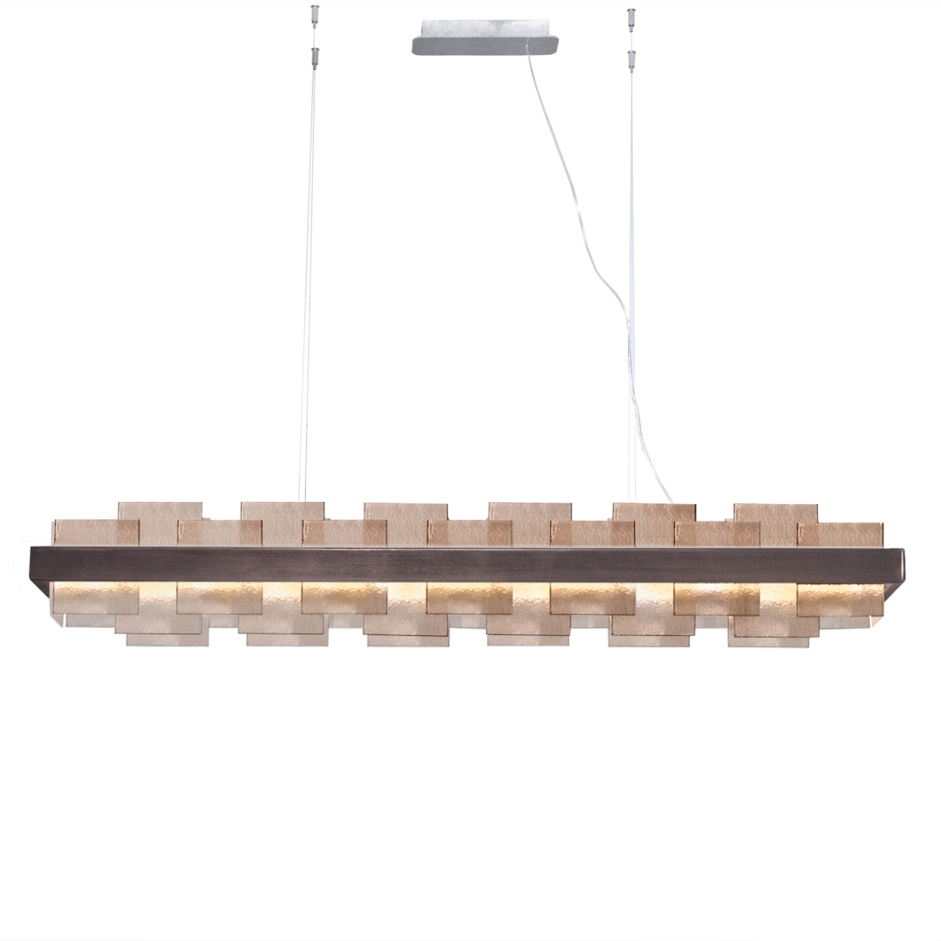 Линейный подвесной светильник с вытянутым корпусом длиной 155 см, закреплённым на тросах к потолочной площадке. Конструкция представляет собой горизонтальную планку с рельефной ступенчатой структурой из повторяющихся элементов, формирующих объём по всей длине. Внутренний светодиодный источник работает через полупрозрачный материал с отделкой fumé, создавая равномерное свечение вдоль всей линии. Верхняя часть корпуса выполнена в тёмной отделке brunito brushed, подчёркивающей геометрию конструкции. Высота подвеса регулируется в диапазоне от 29 до 262 см. Используется для освещения вытянутых поверхностей, таких как столы или барные зоны.