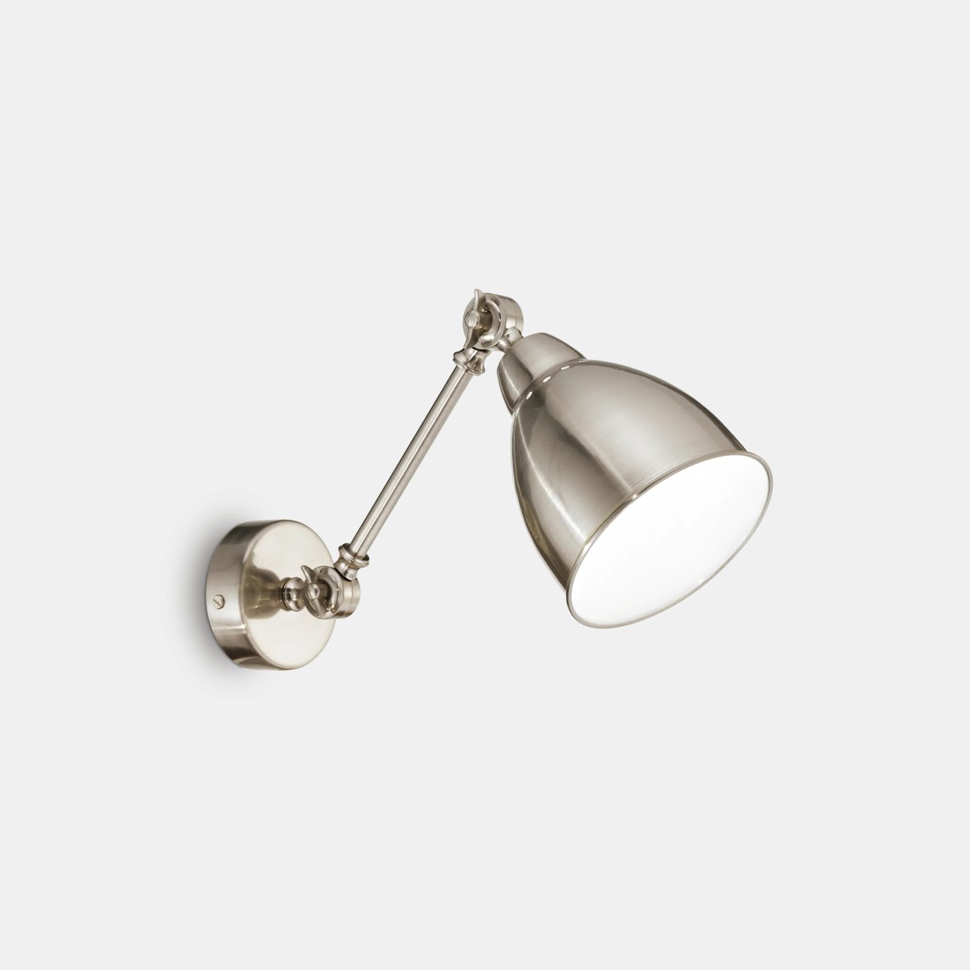 Настенное бра с поворотным рычагом и металлическим плафоном рассчитано на точечную подсветку рабочей зоны. В коллекции Newton от Ideal Lux модель AP1 в отделке никель выполнена из металла и оснащена шарнирным механизмом, который позволяет менять угол наклона и вылет плафона до 44 см от стены. Один цоколь E27 даёт возможность установить лампу мощностью до 60 Вт, подбирая яркость под конкретную задачу — от чтения в кресле до подсветки письменного стола. Когда человек поворачивает голову или меняет положение в кресле, плафон можно направить точно на книгу, не освещая всю комнату. Металлический корпус ограничивает боковое рассеивание и формирует акцентный свет с контролируемой зоной падения. Степень защиты IP20 и подключение к сети 220–240 В рассчитаны на использование в сухих помещениях без функции диммирования.