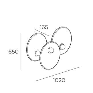 Настенный светильник Leds C4 из коллекции Trip выполнен в виде композиции из трёх круглых дисков одинакового диаметра 460 мм, закреплённых на общей основе и смещённых относительно друг друга по горизонтали и вертикали. Конструкция изготовлена из алюминия и стали с отделкой в металлическом чёрном цвете, а в центре каждого элемента расположен опаловый стеклянный диффузор, через который проходит свет. Общая длина достигает 1020 мм при ширине 650 мм, что формирует крупную настенную композицию. Используются три источника света с цоколем E14 мощностью до 7 Вт каждый, суммарно 21 Вт, степень защиты IP20 указывает на применение в интерьере.