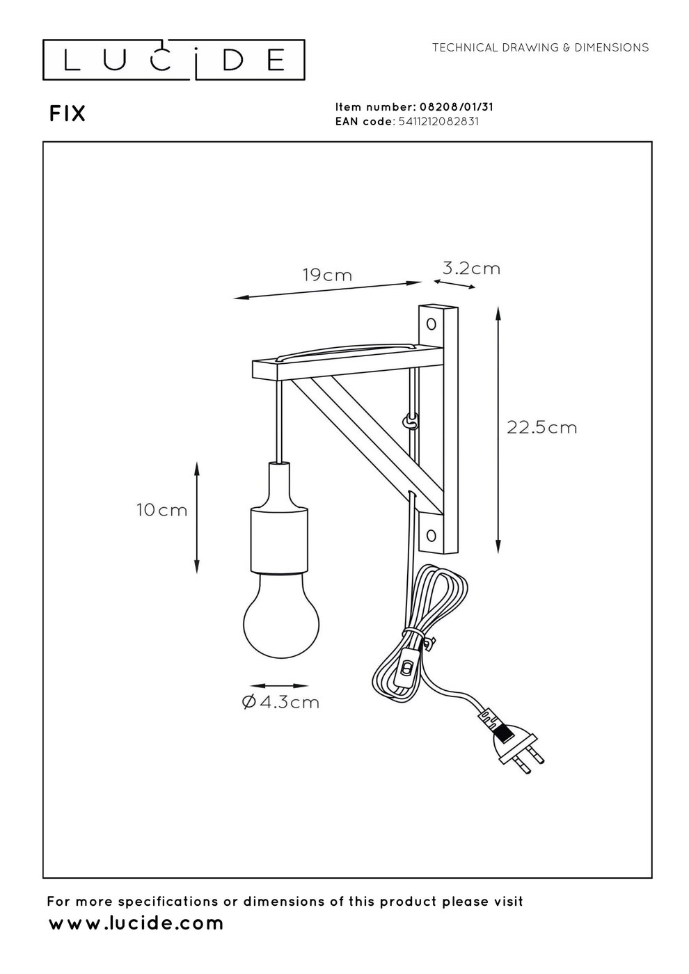 Настенный светильник состоит из деревянного держателя в форме треугольника и подвешенной лампы с патроном E27, корпус не закрыт, лампа открыта. Высота установки регулируется за счёт положения деревянной рамки, а включение и выключение осуществляется переключателем на шнуре длиной 290 см. Размеры светильника составляют 19 × 3,2 × 22,5 см, максимальная мощность лампы 60 Вт, лампа в комплект не входит. Свет рассеивается вокруг, угол освещения не направленный. Конструкция позволяет легко изменять высоту лампы после установки, корпус и арматура выполнены из древесины, степень защиты IP20 ограничивает применение в помещениях.