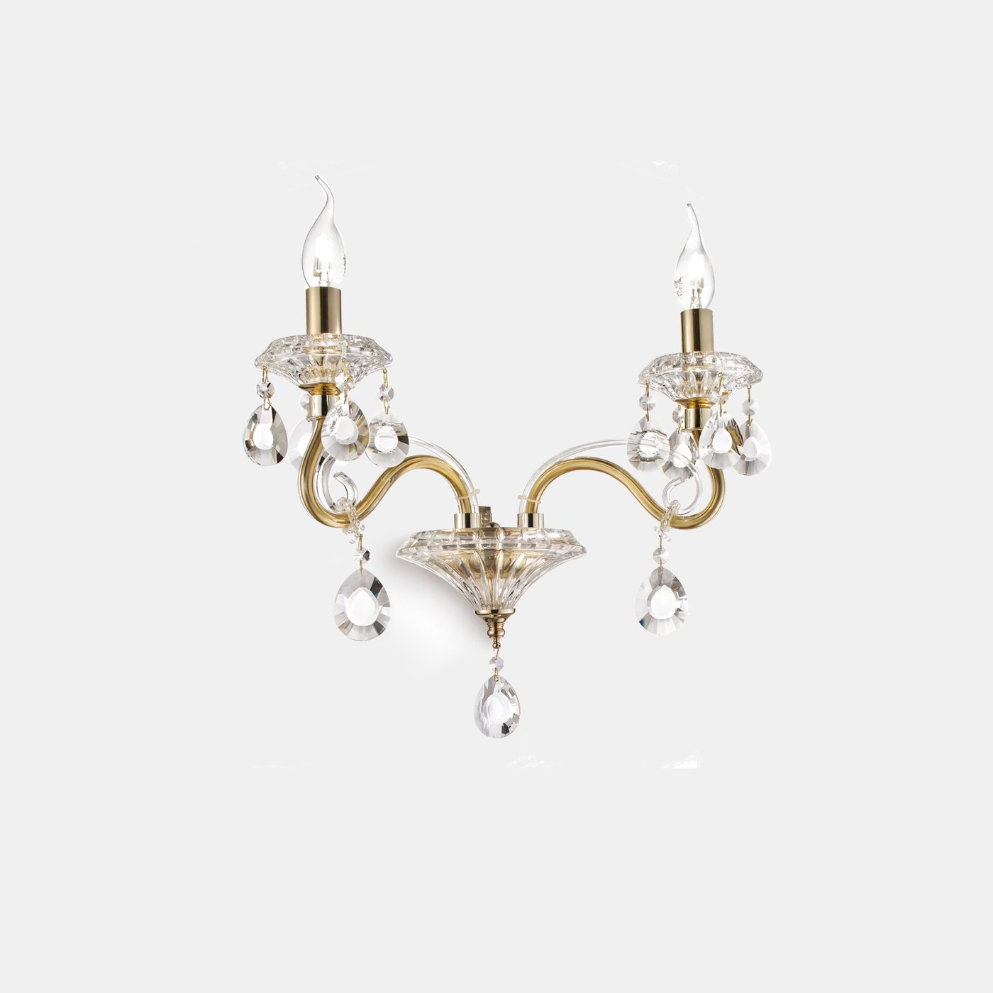 Настенное бра Ideal Lux из коллекции Negresco выполнено в классической форме на два рожка с прозрачными стеклянными элементами и декоративными подвесками. Изогнутые металлические держатели поддерживают патроны с цоколем E14, а открытые лампы формируют направленный вверх и в стороны свет, создавая мягкую засветку стены и лёгкую игру бликов в кристаллах. При установке в гостиной или в паре по обе стороны зеркала бра работает как акцентный свет, дополняя основное освещение и добавляя глубину интерьеру. Два источника позволяют гибко подобрать яркость и температуру света в зависимости от задачи — от спокойной вечерней атмосферы до более выразительной декоративной подсветки. Компактная ширина около 25,5 см делает модель удобной для размещения в нишах и на простенках, степень защиты IP20 рассчитана на сухие помещения.