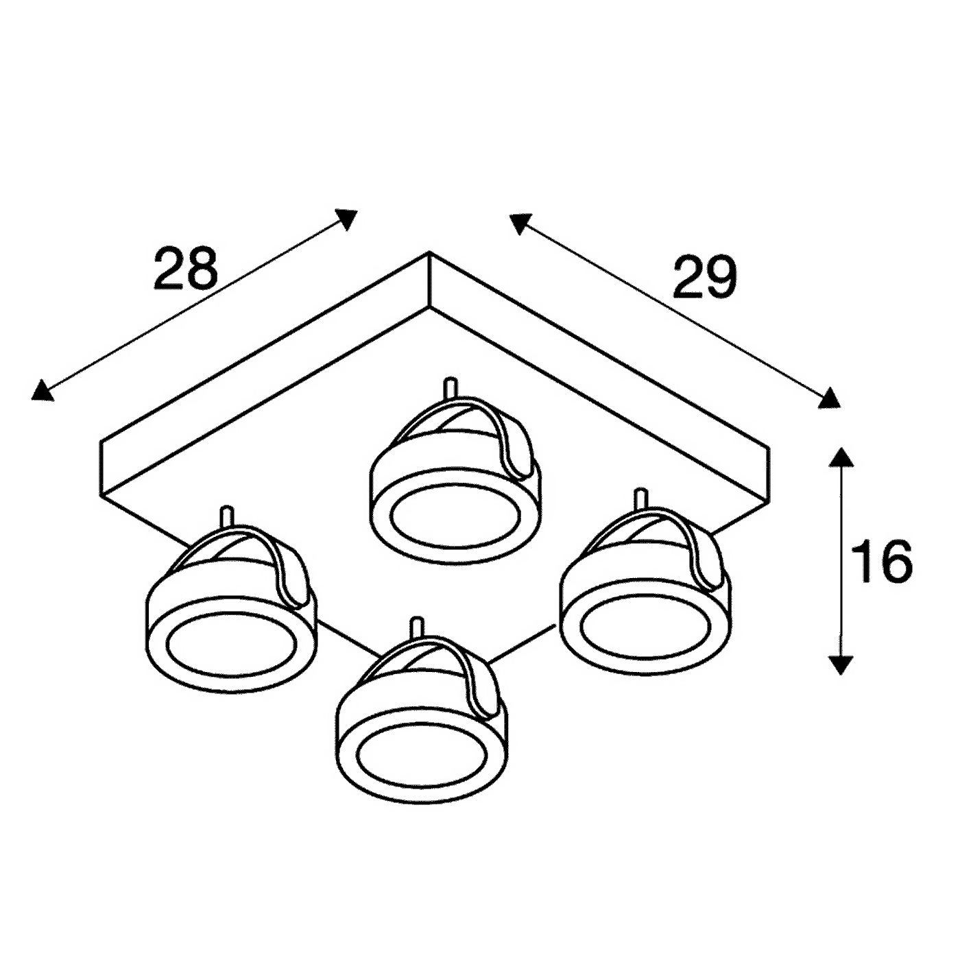 Накладной трековый потолочный светильник с четырьмя подвижными головками для ламп ES111 мощностью до 75 Вт каждая выполнен в черном цвете. Конструкция позволяет индивидуально направлять световые потоки и затемнять свет, обеспечивая гибкость в организации освещения. Светильник предназначен для монтажа на потолок в помещениях и подключается к сети 230 В. Размер основания 28×29 см при высоте 16 см задаёт масштаб и позволяет оценить размещение светильника, совместим с лампами классов энергопотребления E–A++, обеспечивая регулировку яркости и направленности света для локального или акцентного освещения.