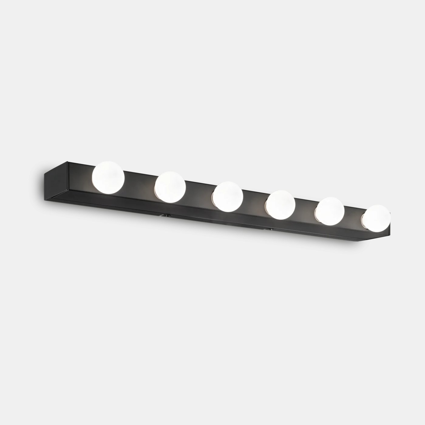 Линейное бра из коллекции Prive от Ideal Lux выполнено в чёрном металлическом корпусе с шестью открытыми патронами, расположенными на одной планке. Такая конструкция формирует равномерную горизонтальную засветку без провалов между источниками, что важно при установке над зеркалом или вдоль стены. Отсутствие рассеивателя делает характер света зависимым от выбранных ламп: матовые колбы смягчают поток для локального освещения, прозрачные усиливают графичность и подчёркивают ритм световых точек. Цоколь E14 и допустимая мощность до 6×40 Вт позволяют набрать достаточную яркость для работы перед зеркалом, когда человек поворачивает голову и не должен видеть резких теней. Питание 220–240 В и класс защиты I обеспечивают стандартное подключение без отдельного драйвера, а степень IP20 указывает на использование в сухих помещениях. Модель не поддерживает диммирование, поэтому сценарий освещения задаётся подбором ламп по мощности и температуре света.