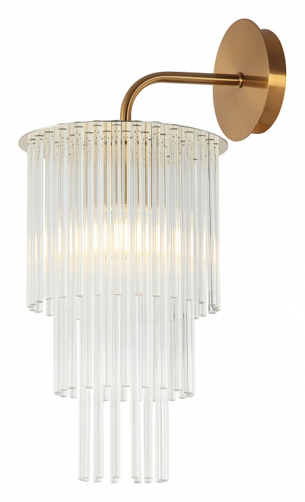 Настенный светильник с выносным креплением на круглой розетке и коротком изогнутом кронштейне, к которому подвешен многоярусный стеклянный плафон. Плафон собран из вертикальных прозрачных стержней, образующих каскадную структуру с постепенным увеличением длины элементов книзу, за счёт чего формируется ступенчатый силуэт. Внутри размещён источник света мощностью до 40 Вт, свет проходит через стеклянные элементы и распределяется вниз и в стороны с преломлением на гранях. Металлические части выполнены с золотистым покрытием, что влияет на общий оттенок освещения и подчёркивает конструкцию как декоративное настенное бра.