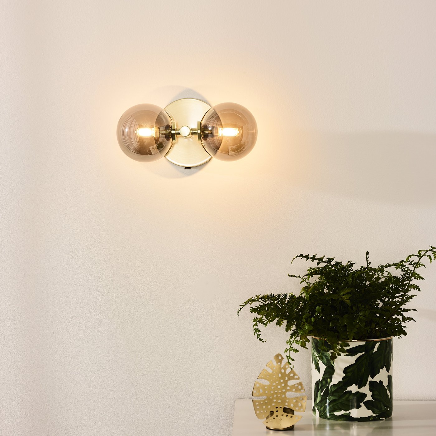 Настенный светильник с двухламповой компоновкой, в которой источники света размещены в отдельных стеклянных сферах, закреплённых друг над другом на горизонтальном металлическом держателе. Конструкция основана на круглом настенном основании из стали, от которого выходит короткий цилиндрический кронштейн с двумя патронами. Плафоны выполнены из стекла и частично скрывают лампы, создавая рассеянное освещение вокруг светильника. Используются две лампы с цоколем G9 мощностью до 28 Вт каждая, при этом сами лампы в комплект не входят. Габариты составляют примерно 12×15×24,5 см, питание от сети 230 В, предусмотрена возможность диммирования, что позволяет регулировать уровень освещённости.