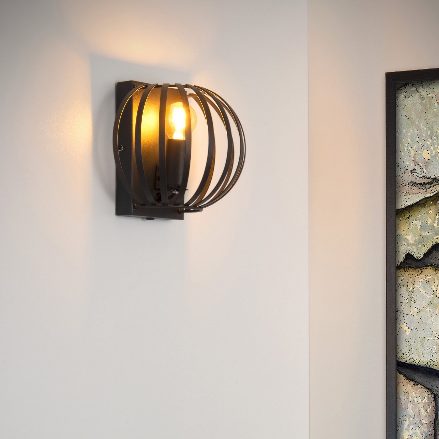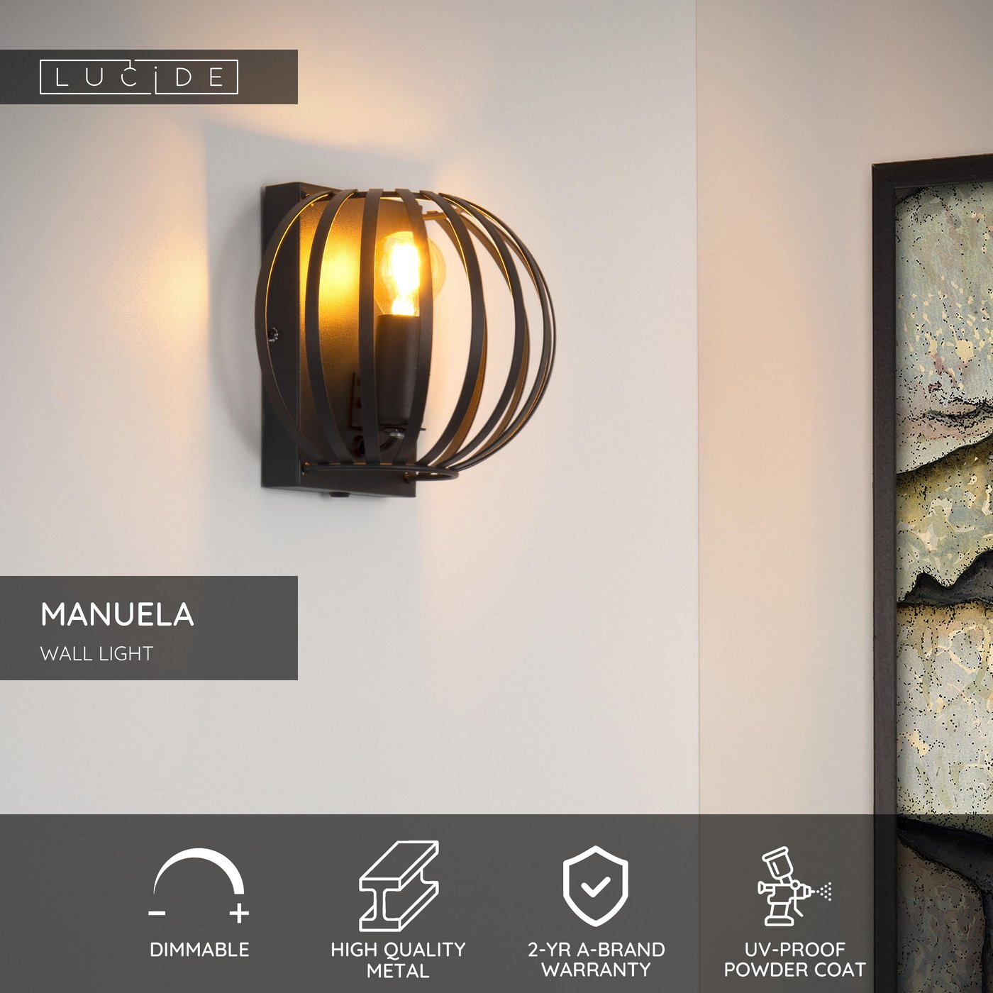 🆔 Настенный светильник с круглым металлическим плафоном и решёткой черный MANUELA by Lucide