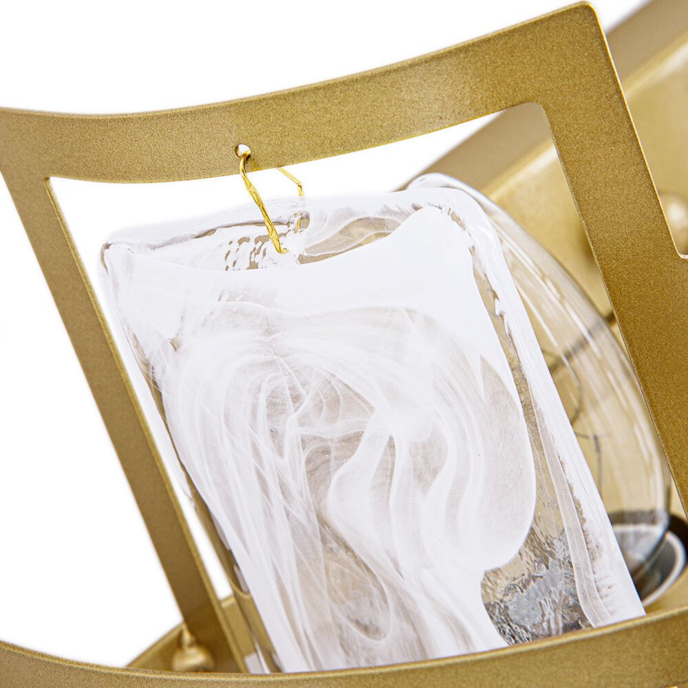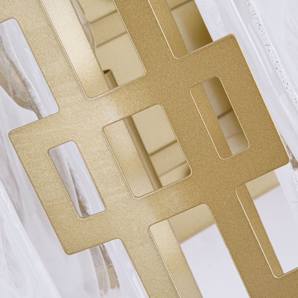Настенный светильник Arte Lamp Blake выполнен в современном стиле и отличается выразительной графичной композицией с чётким ритмом линий. Металлическая арматура матового золотого цвета образует открытую геометрическую рамку, внутри которой расположен плафон из стекла с эффектом белого алебастра и матовой поверхностью. Такая конструкция создаёт мягкое рассеянное свечение и подчёркивает декоративный характер модели. Светильник рассчитан на две лампы с цоколем E14 мощностью до 40 Вт каждая, лампы в комплект не входят, а суммарная мощность составляет 80 Вт. Габариты изделия 280×240×150 мм делают его удобным для настенного размещения в жилых интерьерах. Направление светового потока вверх и вниз усиливает архитектурную выразительность формы. Модель предназначена для использования в гостиной, кабинете или коридоре и гармонично вписывается в современные интерьерные решения, что подтверждается представленными интерьерными сценами.