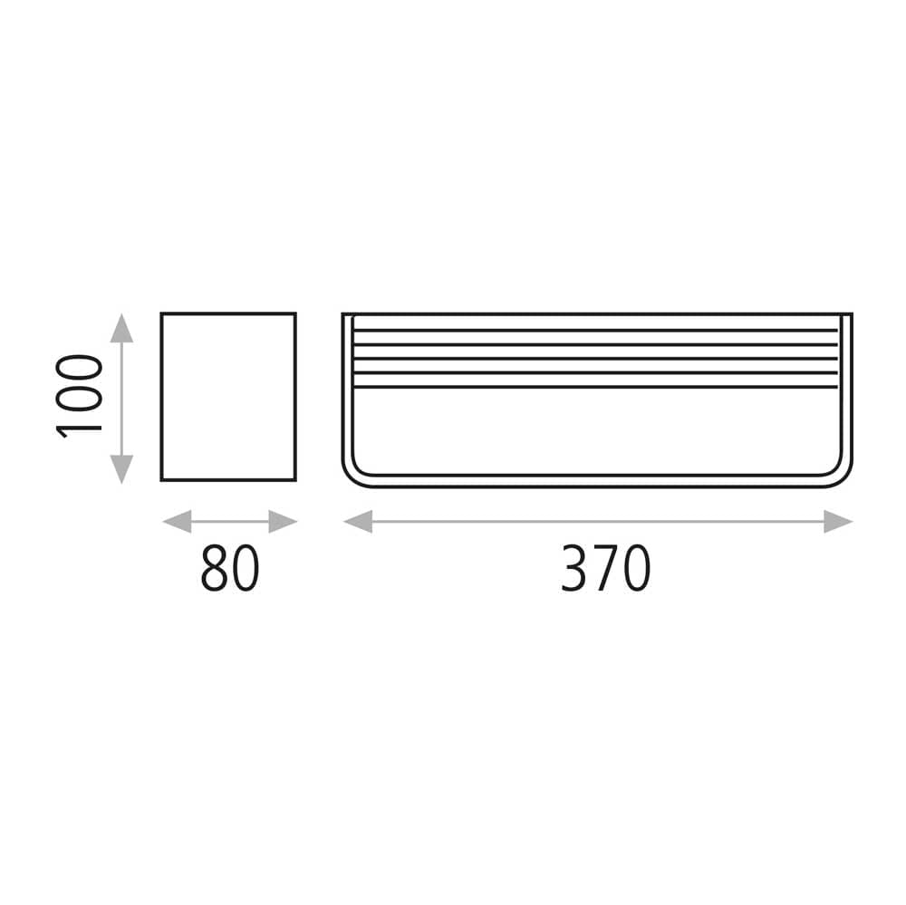Настенный светильник представляет собой прямоугольный корпус с текстурированной поверхностью, выполненный в белом цвете, с интегрированным LED-модулем мощностью 21 Вт и световым потоком 2200 лм. Светильник обеспечивает направленное освещение вверх и вниз от стены, цветовая температура 3000K, управление яркостью осуществляется через симисторный диммер. Габариты корпуса — длина 370 мм, ширина 80 мм, высота 100 мм. Чертёж показывает точные размеры и форму изделия, а фотографии демонстрируют установку на стену и распределение света, создавая равномерное освещение с текстурированным эффектом на поверхности.