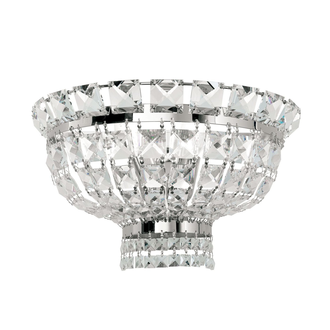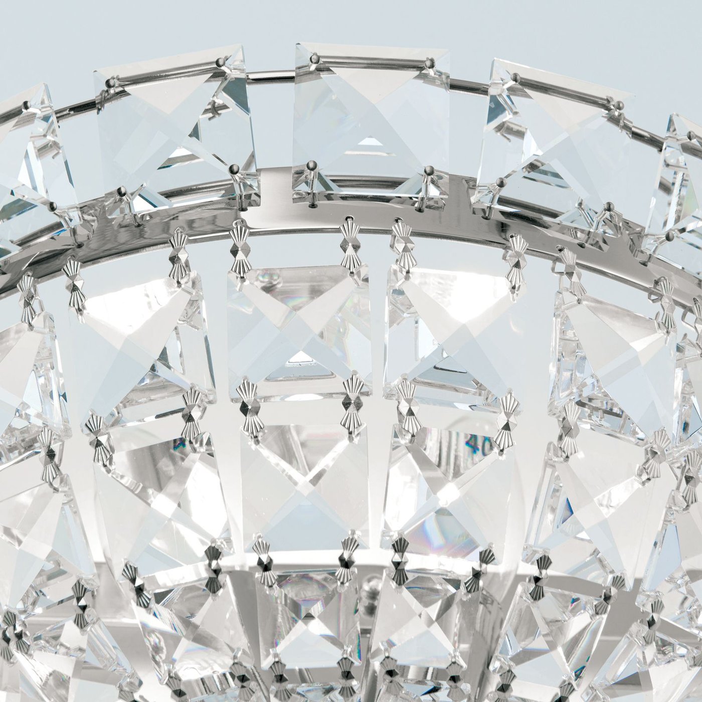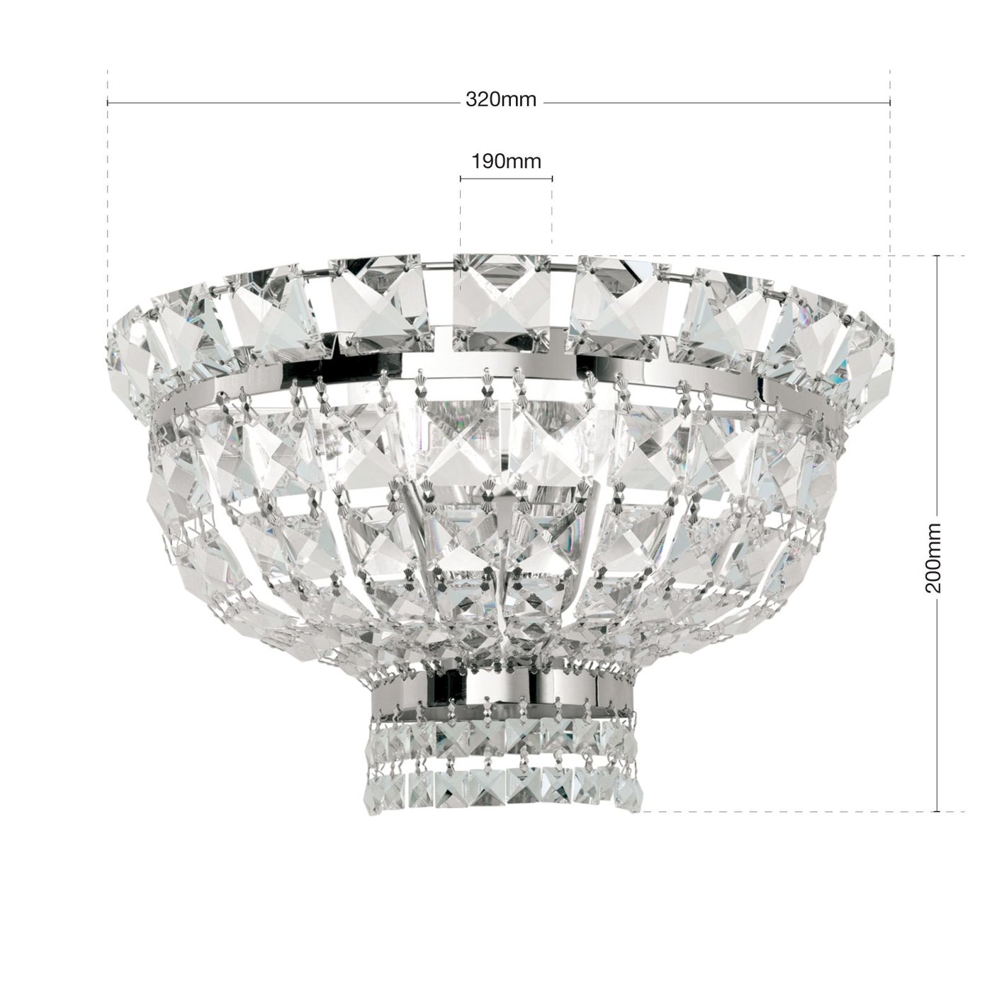 Настенное бра выполнено в стиле ампир с использованием кристаллов STRASS® Swarovski® и латунной арматуры, предназначено для внутреннего размещения. Конструкция состоит из двух цельнолитых латунных элементов и цепочек кристаллов квадратной огранки, образующих полукруглый плафон, который рассеивает свет и создаёт декоративный эффект. Светильник рассчитан на две лампы с цоколем E14, мощность до 40 Вт каждая, диммируемый. Размеры составляют ширину 32 см, высоту 20 см и глубину 19 см, масса 2,1 кг. Отделка хром, плафон полностью из кристалла, бра обеспечивает благородную игру света и подходит для классических интерьеров, включая прихожие и гостиную.