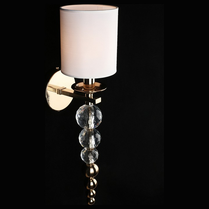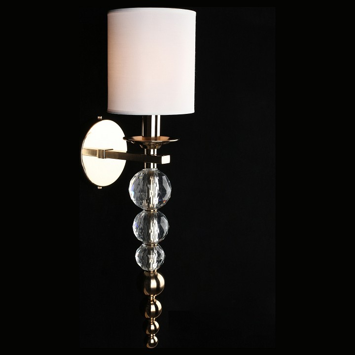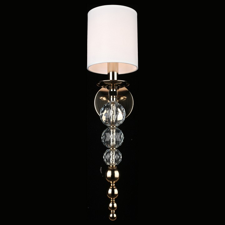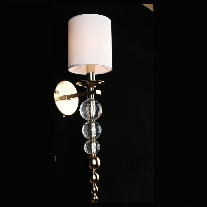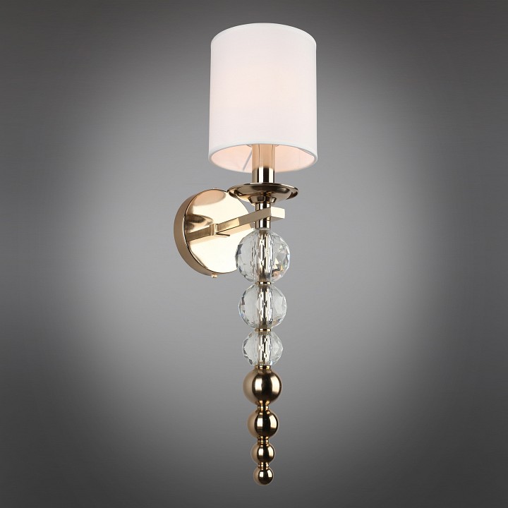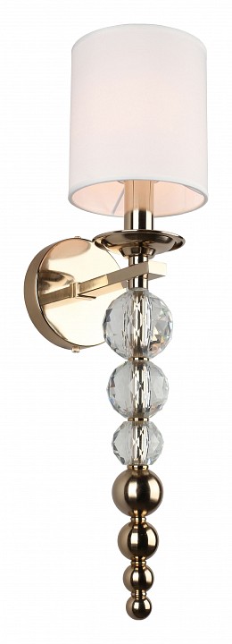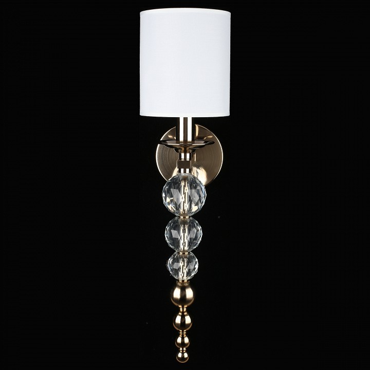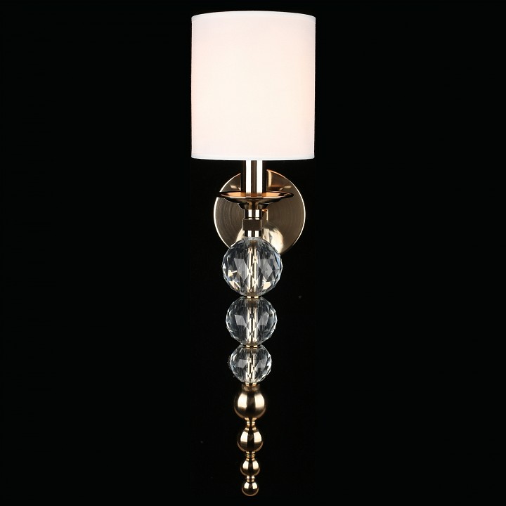 Настенный светильник с текстильным абажуром и декоративной подвесной частью, предназначенный для установки на стену с подключением скрытой проводки. Конструкция включает круглое основание и изогнутый металлический держатель из латуни, от которого вниз опускается вертикальная цепочка из хрустальных шаров и металлических элементов. Сверху установлен цилиндрический абажур из белого текстиля, закрывающий лампу с цоколем E14 мощностью до 40 Вт. Светильник имеет высоту 570 мм и вылет от стены 200 мм, что формирует вытянутую вертикальную композицию с выраженным декоративным элементом под источником света.