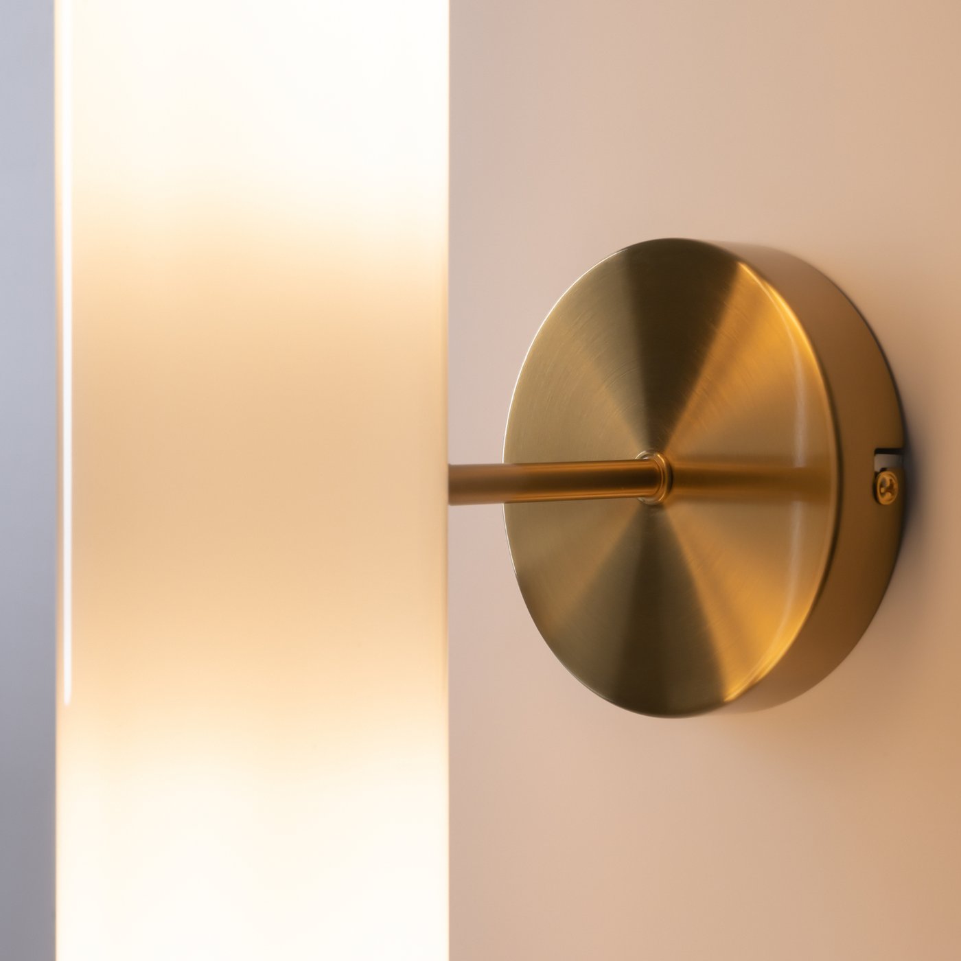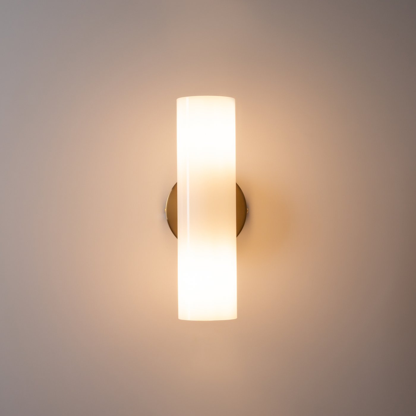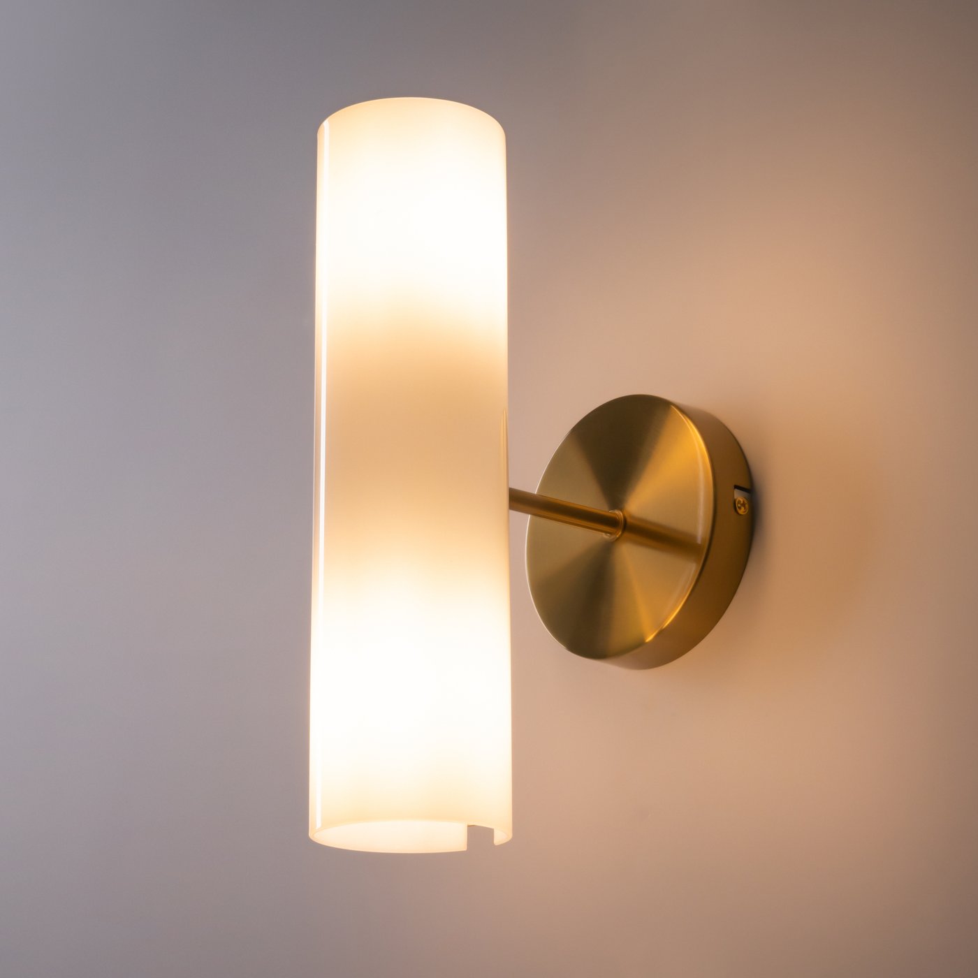 настенный светильник с вытянутым цилиндрическим плафоном из матового стекла на латунном основании