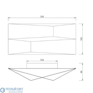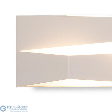 Настенный светильник с направленным вверх и вниз световым потоком, собранный из металлического корпуса сложной геометрии с изломами, формирующими щелевые выходы света. Монтируется на монтажную пластину, рассчитан на подключение к сети 220 В. Встроенный светодиодный источник мощностью 14 Вт даёт световой поток 1250 лм с тёплой температурой 3000 К, предусмотрена возможность диммирования. Габариты 330×150×90 мм задают горизонтально вытянутую форму с небольшим вылетом от стены. Белое матовое покрытие корпуса и плафона снижает блики и подчёркивает направленный характер освещения, что удобно для локальной подсветки стен в жилых помещениях площадью около 7 м².