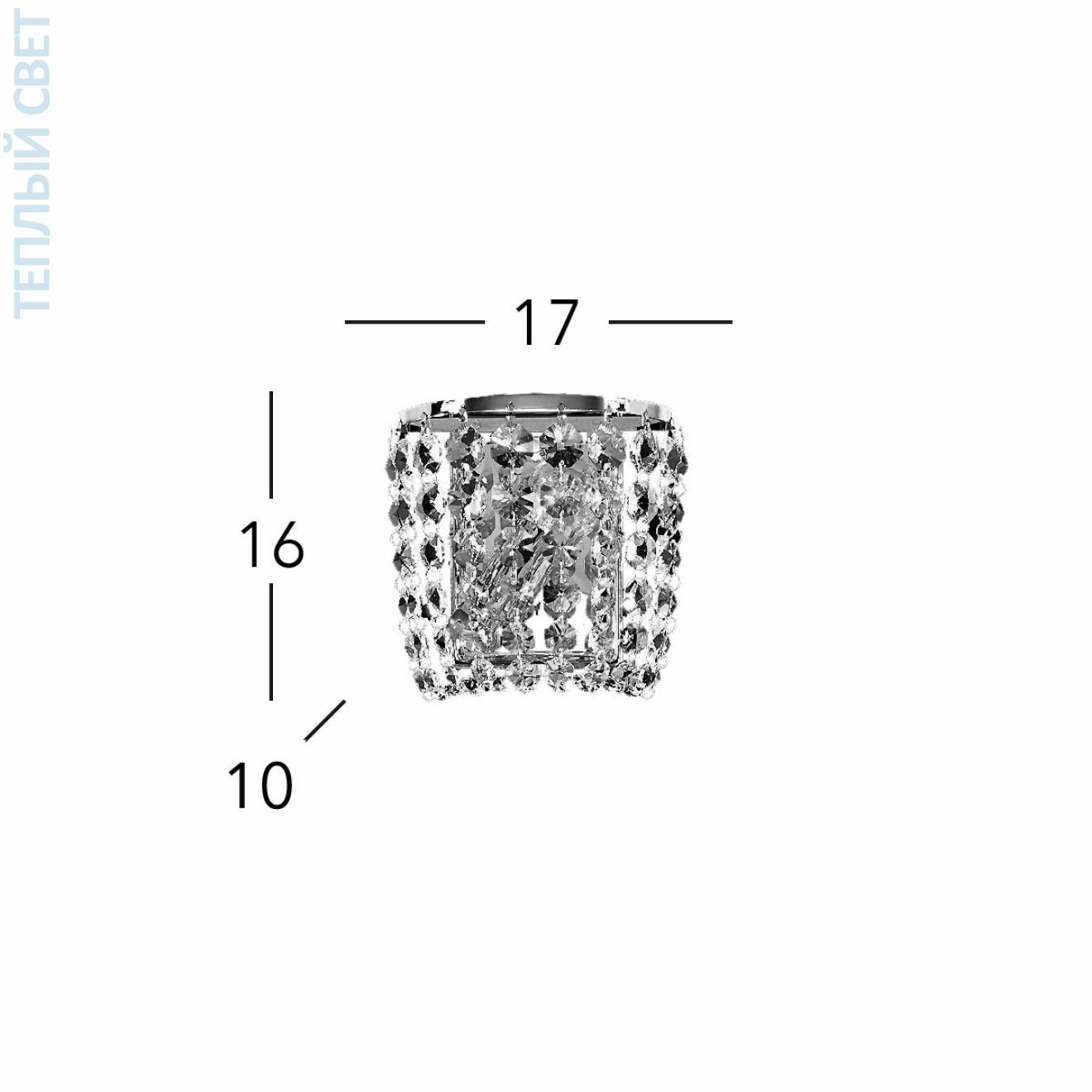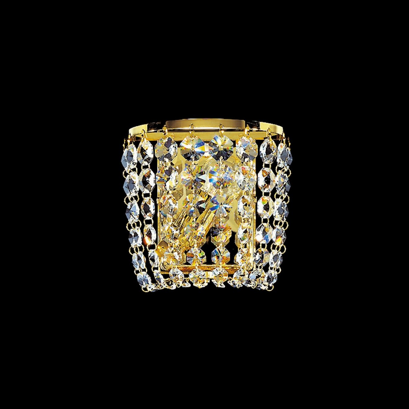 Настенный светильник с компактным корпусом шириной 16 см и высотой 17 см, рассчитанный на установку одной лампы с цоколем E14. Конструкция представляет собой цилиндрическую форму с открытым декоративным каркасом, внутри которого размещён источник света, а внешняя поверхность оформлена подвесками из прозрачных кристаллов, создающих плотный объем вокруг лампы. Основание и несущие элементы выполнены с покрытием под золото 24 карата, что задаёт характерный металлический блеск и подчёркивает структуру светильника. Небольшой вылет от стены около 10 см позволяет использовать модель в качестве локального настенного освещения в жилых помещениях, где важны компактные размеры и выраженная декоративная составляющая.