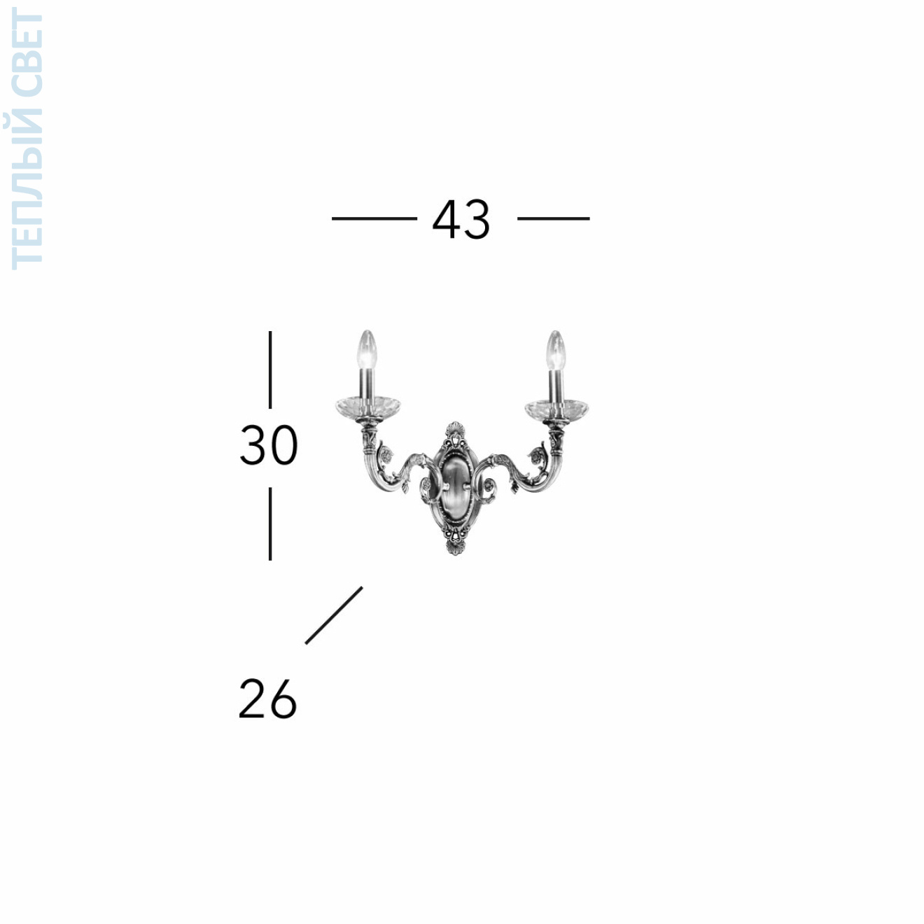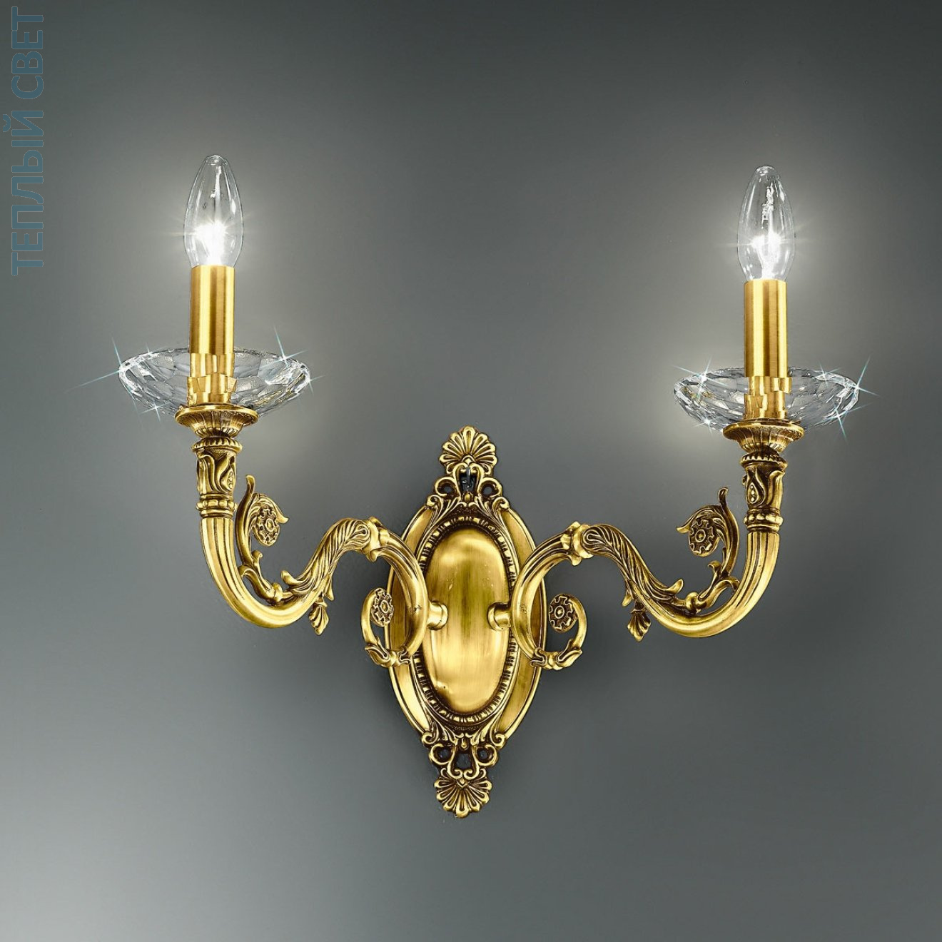Настенный светильник классической формы с центральной декоративной основой и двумя изогнутыми рожками, на концах которых установлены лампы свечного типа с цоколем E14. Каркас выполнен в отделке под французское золото, поверхность украшена рельефными элементами и орнаментом, а под лампами размещены небольшие прозрачные чаши, добавляющие отражение света. Конструкция рассчитана на две лампы и обеспечивает симметричное освещение по сторонам от центра. Габариты 43×30 см задают компактный формат для размещения на стене, светильник подходит для использования в интерьере как дополнительный источник света.